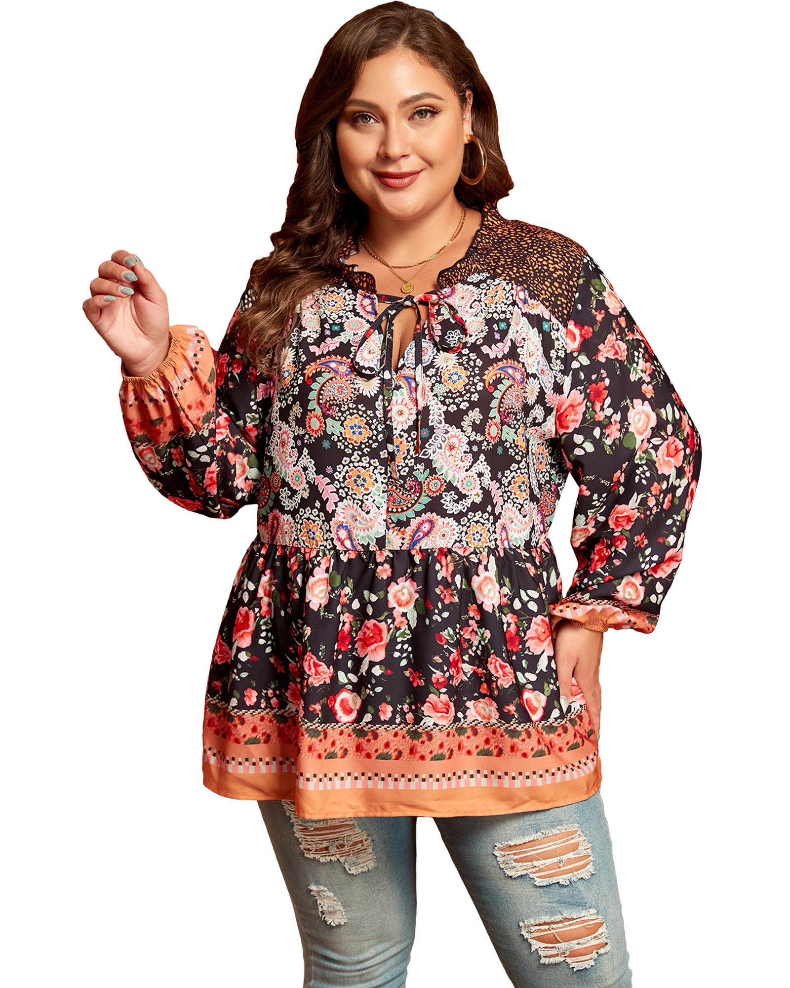 Black Plus Size Paisley Floral Print V Neck Bubble Sleeve Blouse – 1X