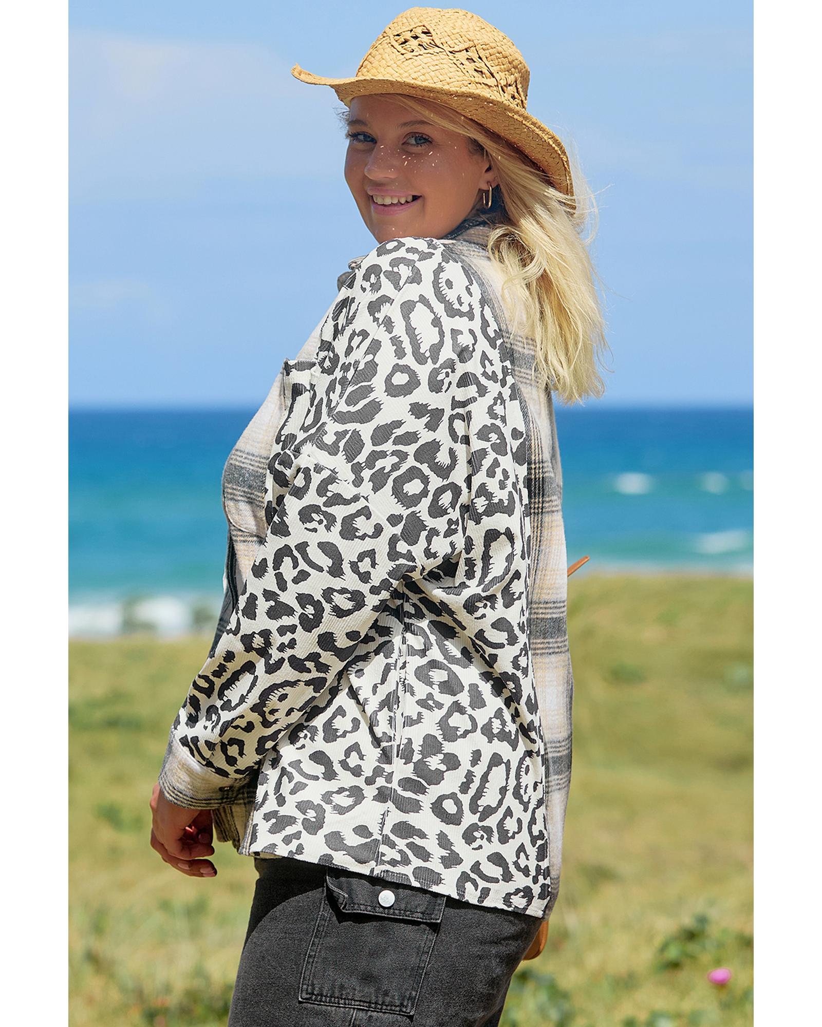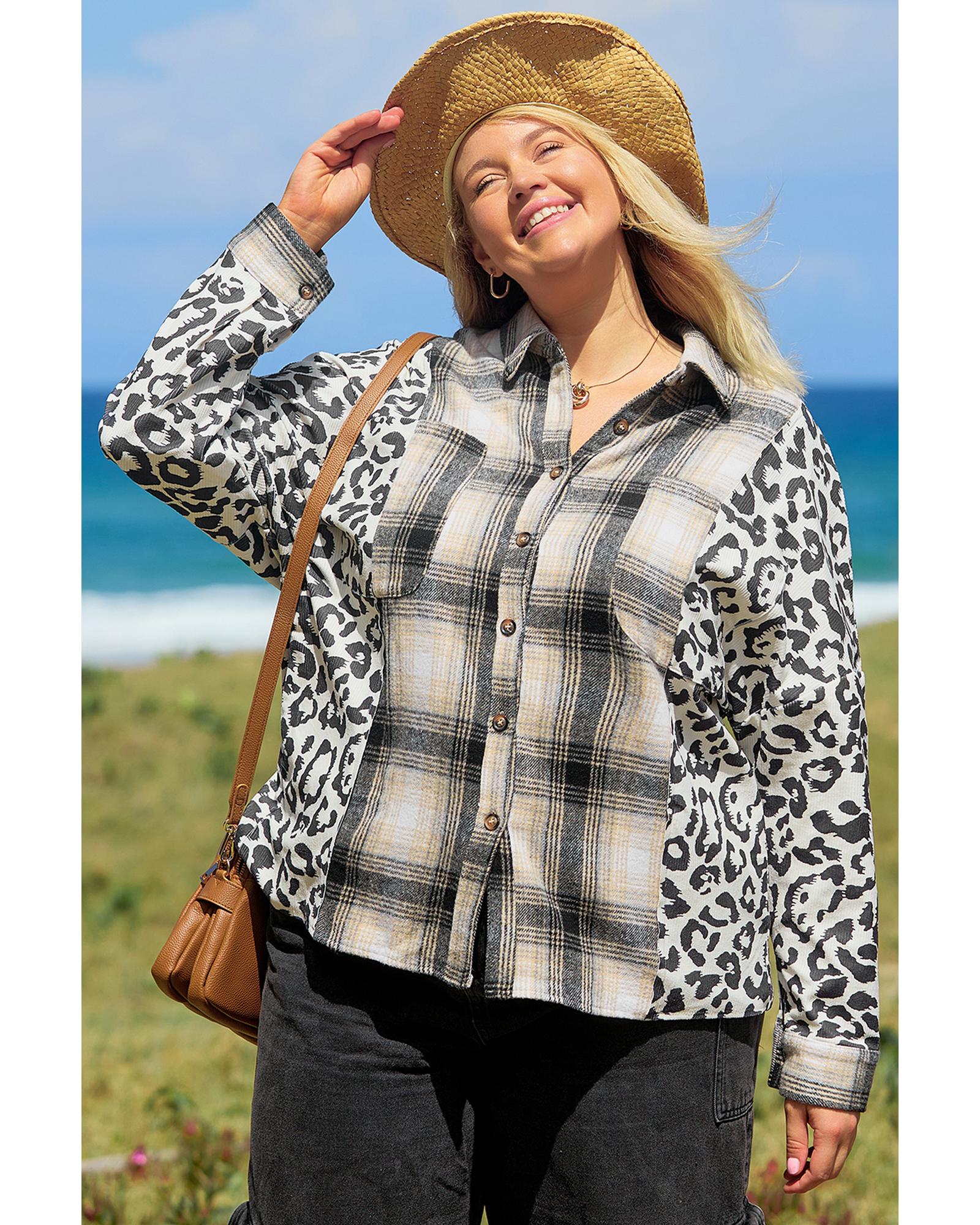 Black Plus Size Plaid Leopard Printed Patchwork Button Up Shacket – 4X