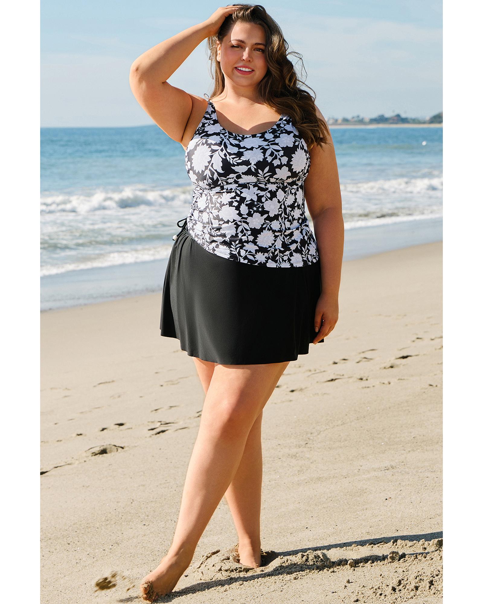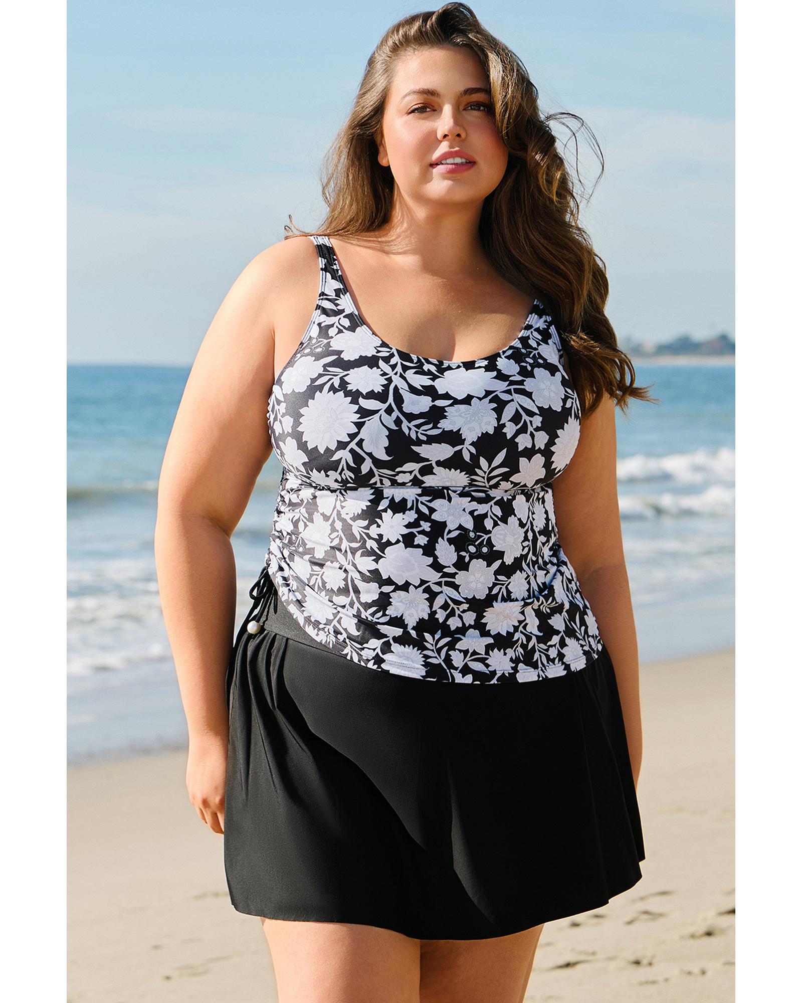 Black Plus Size Printed Square Neck Drawstring Ruffled Tankini Set – 2X