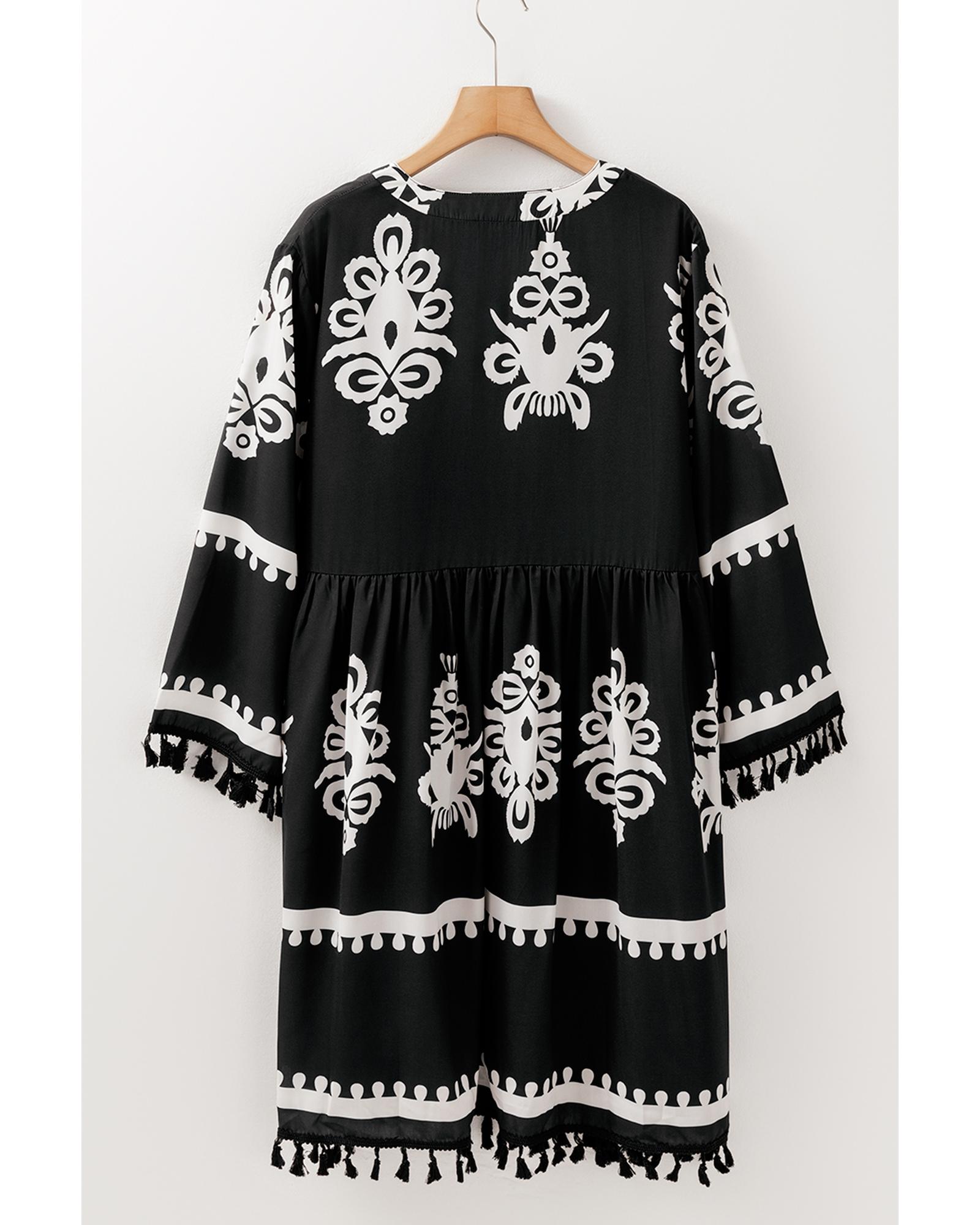 - Black Plus Size Western Floral Print Fringed V Neck Dress