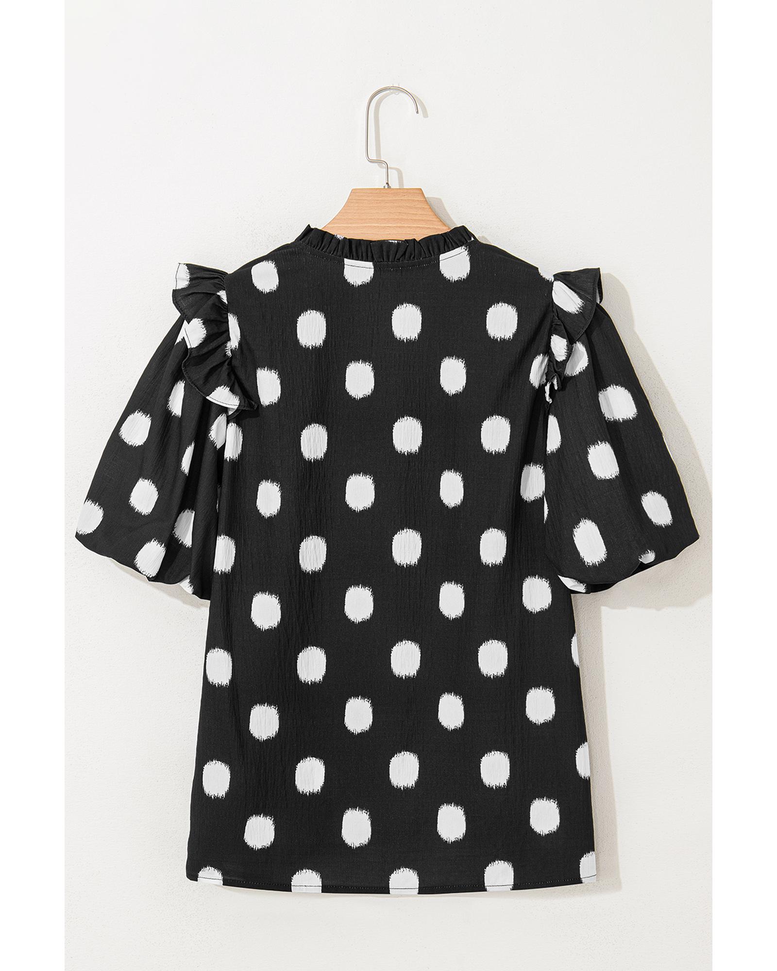 Black Polka Dot Print Shirred Yoke Notched Neck Balloon Sleeve Blouse – M