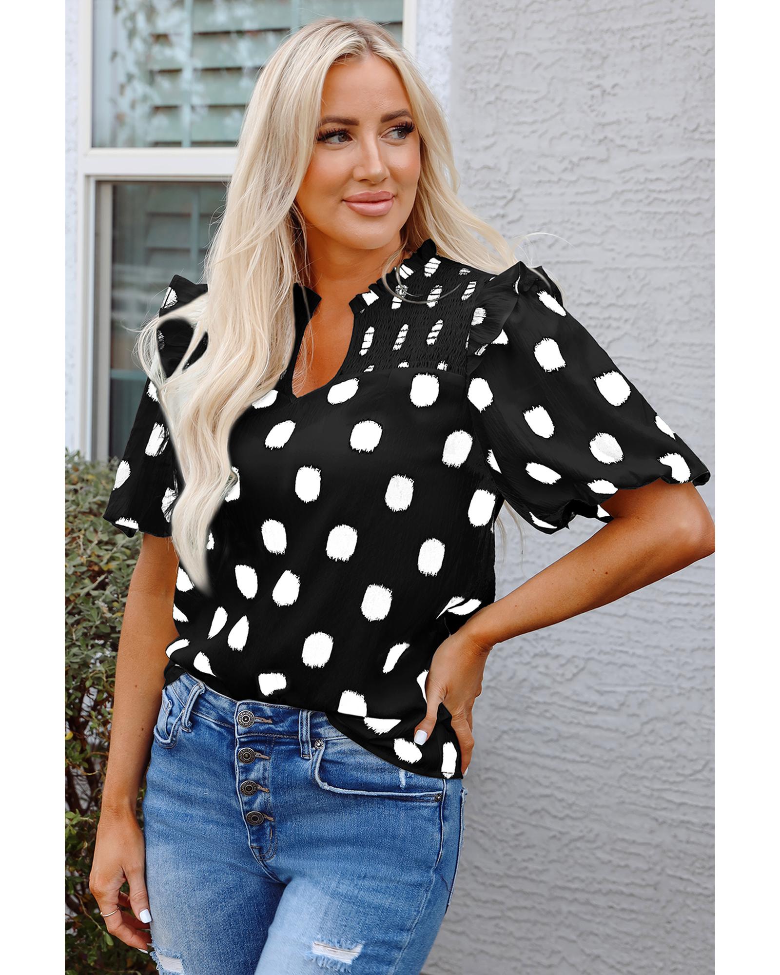 Black Polka Dot Print Shirred Yoke Notched Neck Balloon Sleeve Blouse – XL