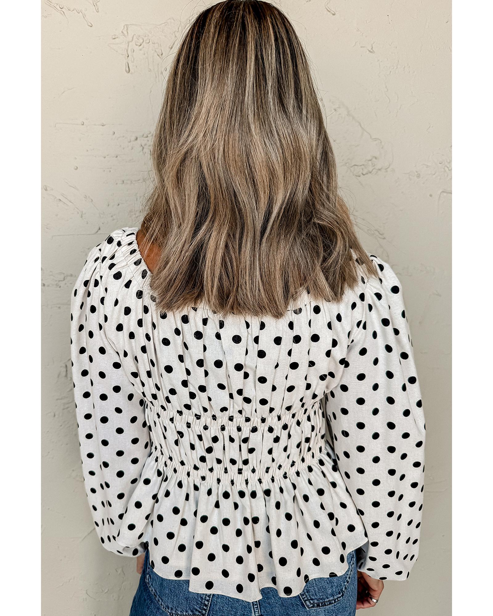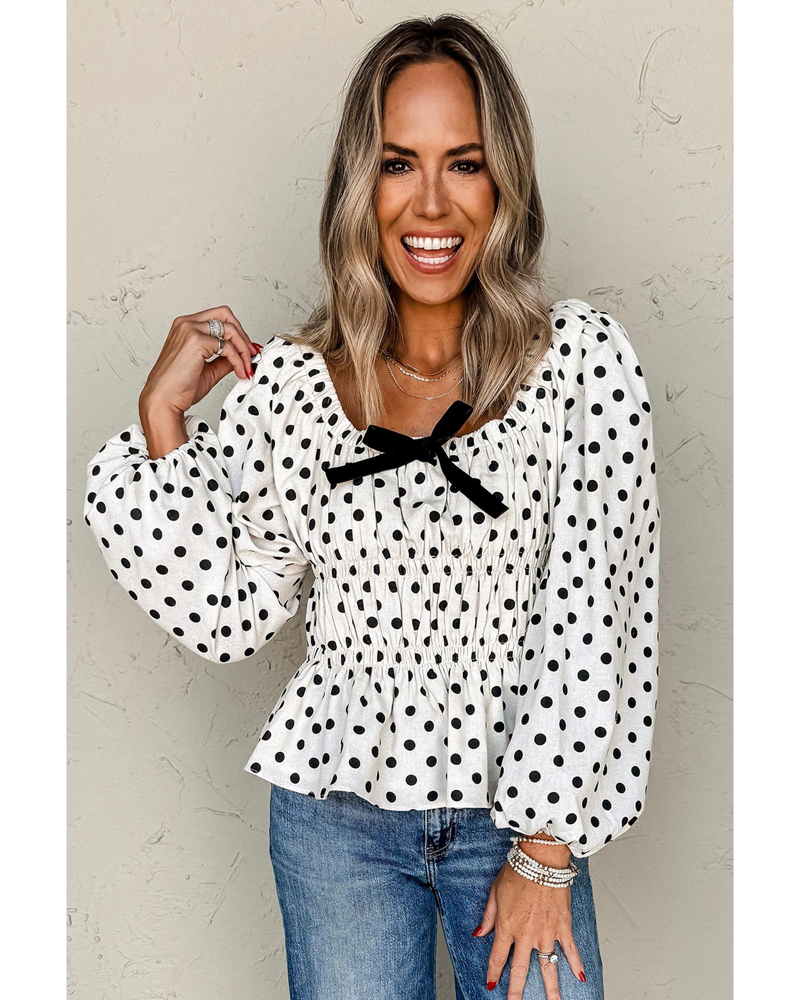 Black Polka Dot Puff Sleeve Bow Square Neck Peplum Top – XL