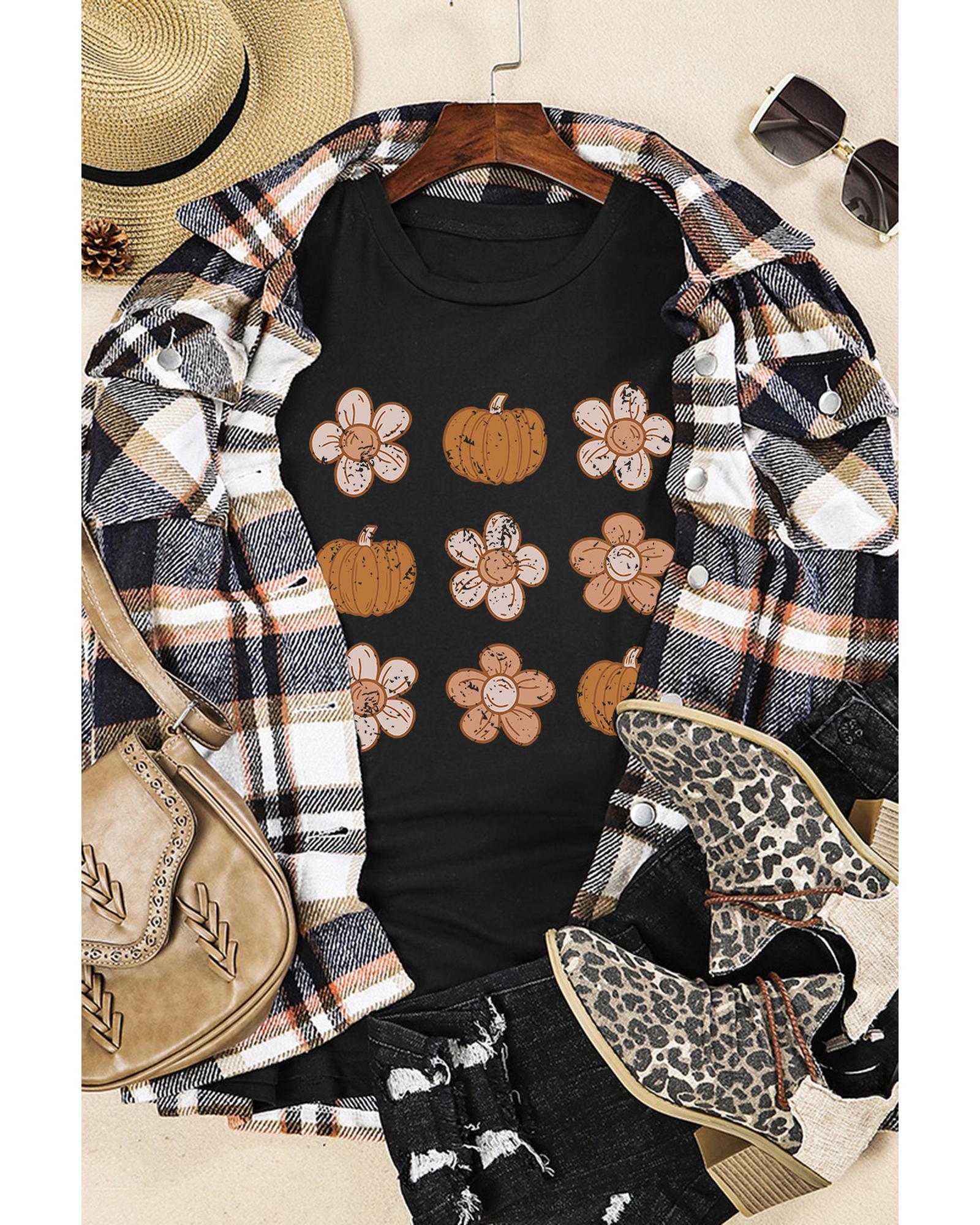 Stylish and trendy Black Pumpkin Flower Print Short Sleeve Graphic Top Made with high - quality materials for a comfortable fit Flattering silhouette enhances your figure Unique pumpkin flower print adds a touch of femininity Versatile and easy to style for casual or dressier occasions Available in various sizes for the perfect fit