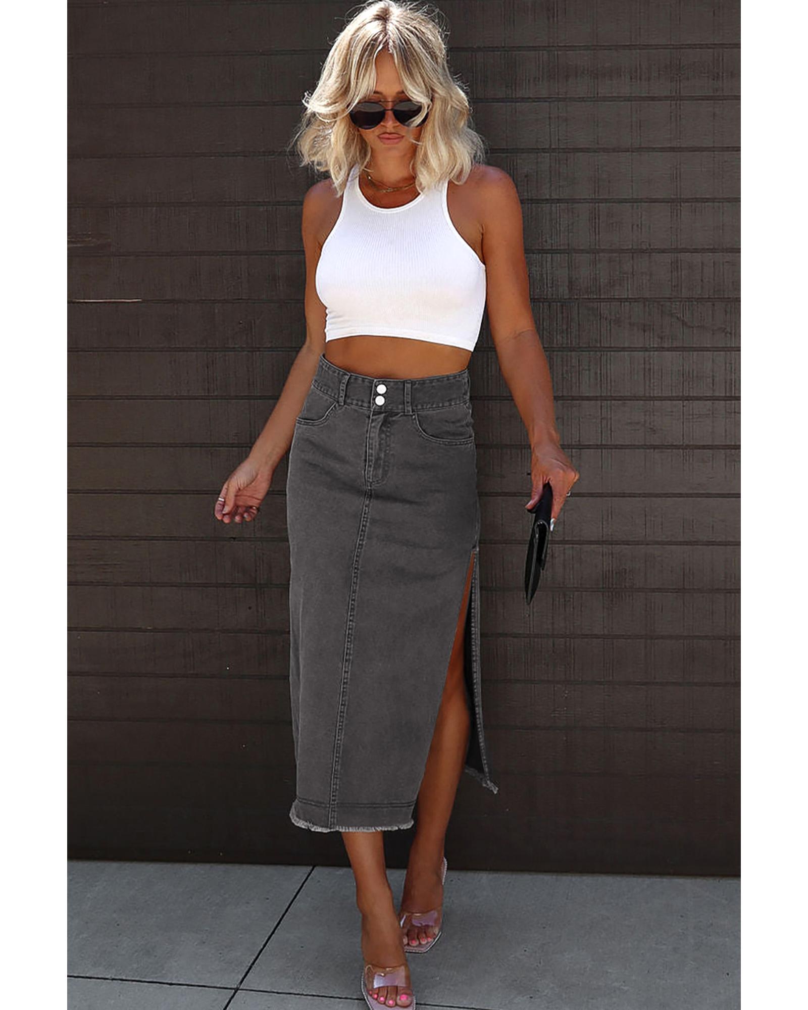 Black Raw Edge Side Slits Buttoned Midi Denim Skirt – L