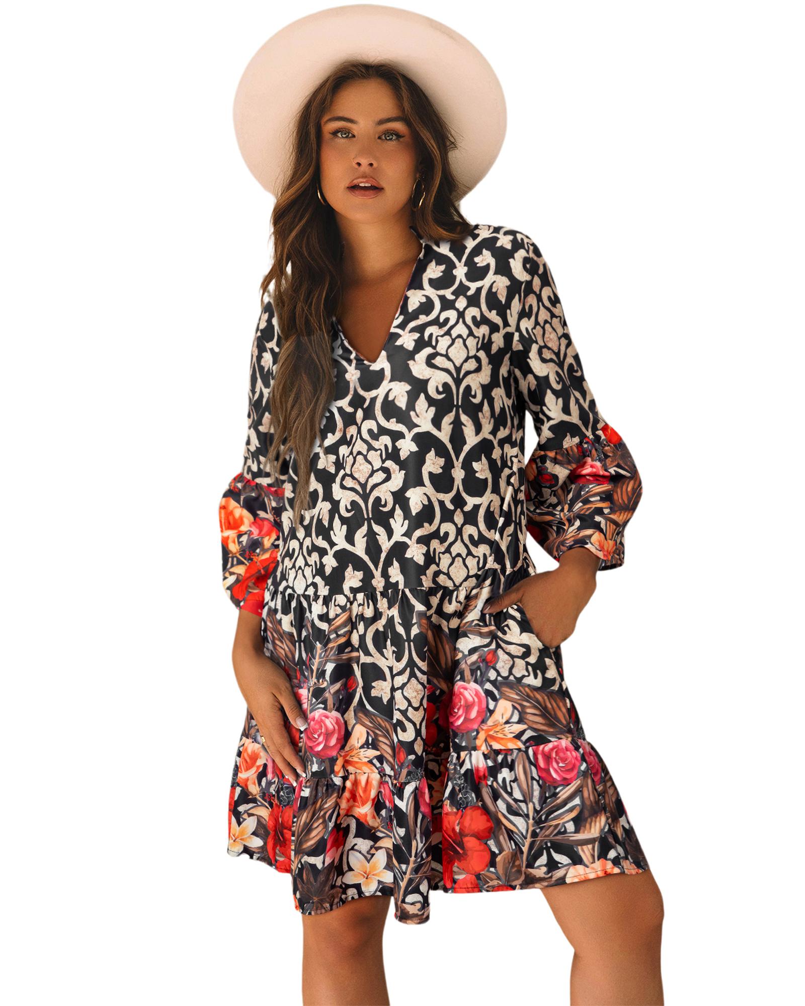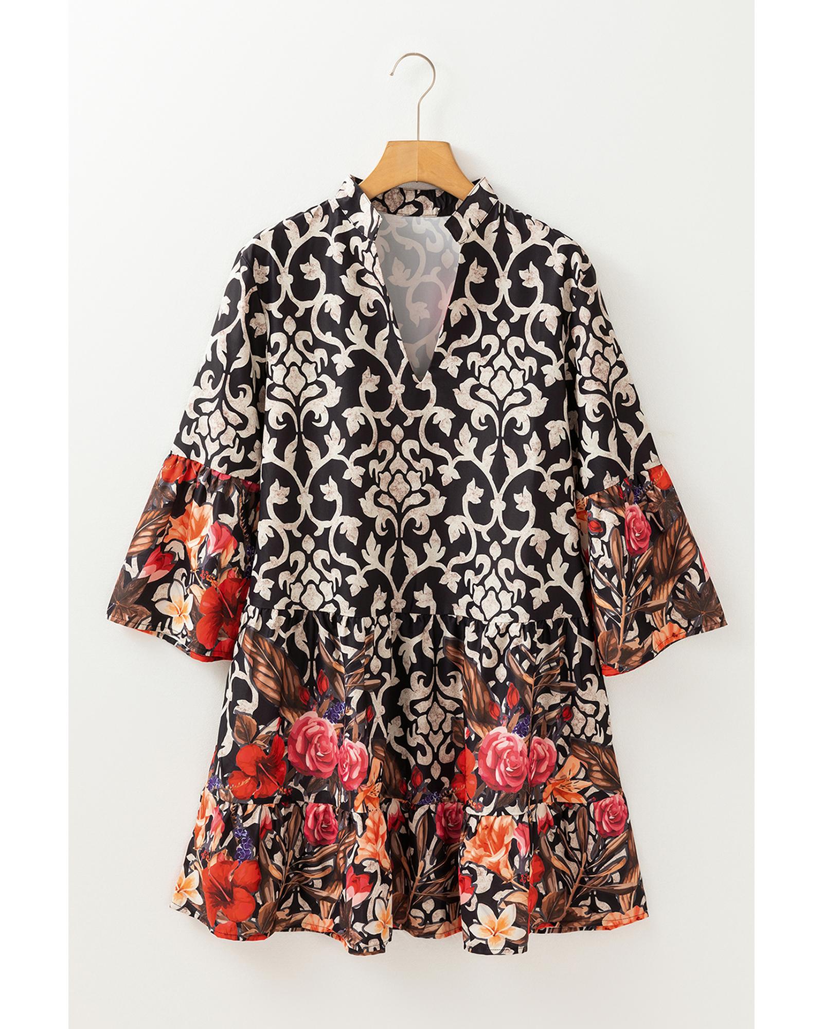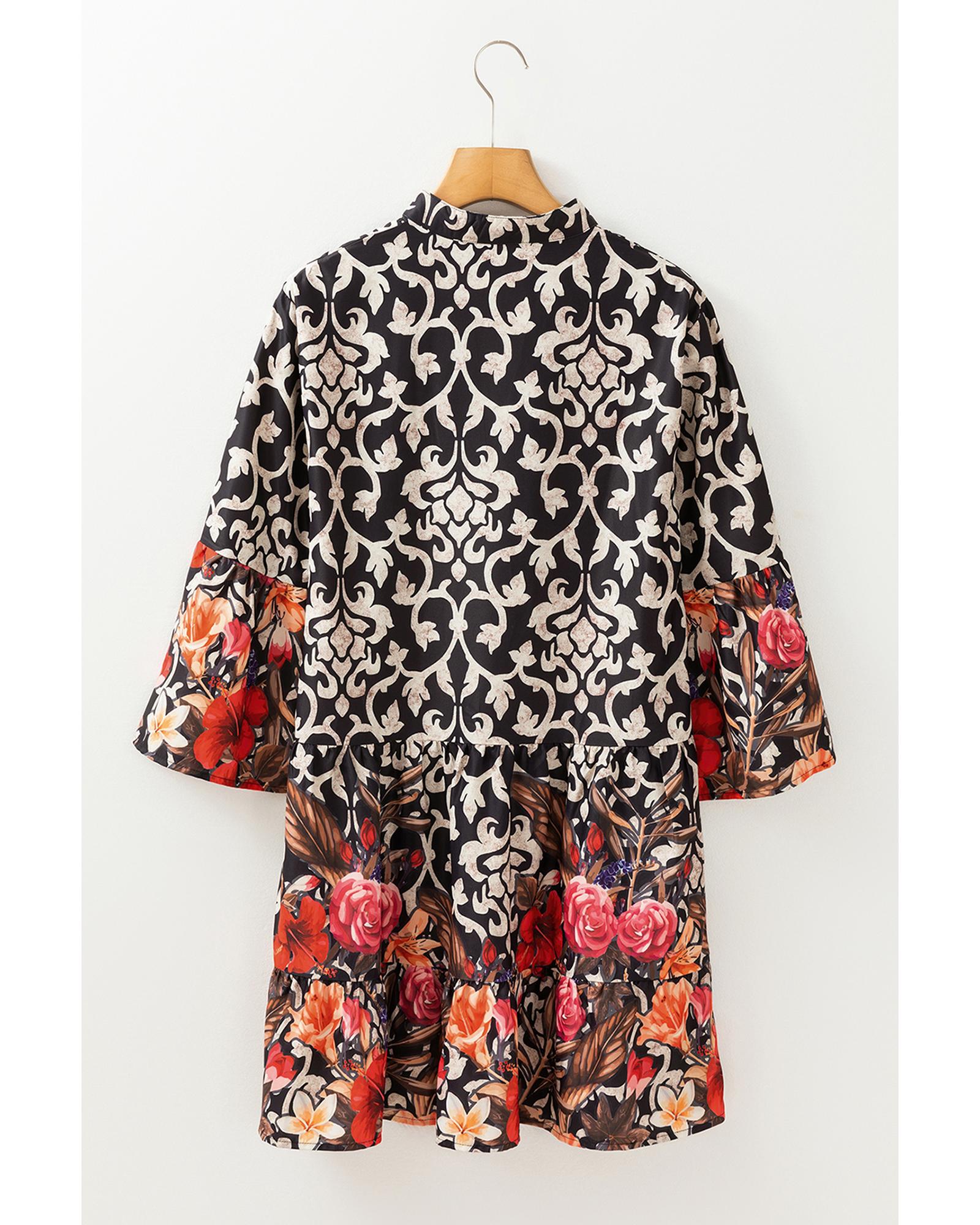 Black Retro Floral Mixed Print Split Neck A-line Dress – S
