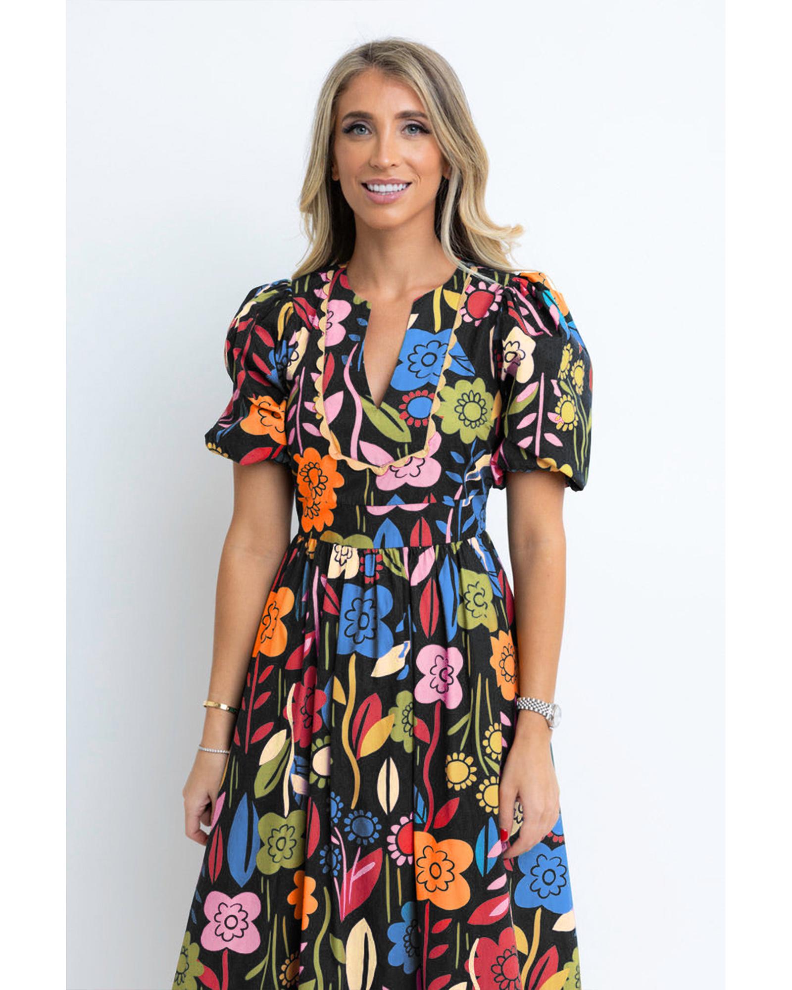 - Charming retro vibe with delicate floral print and elegant silhouette