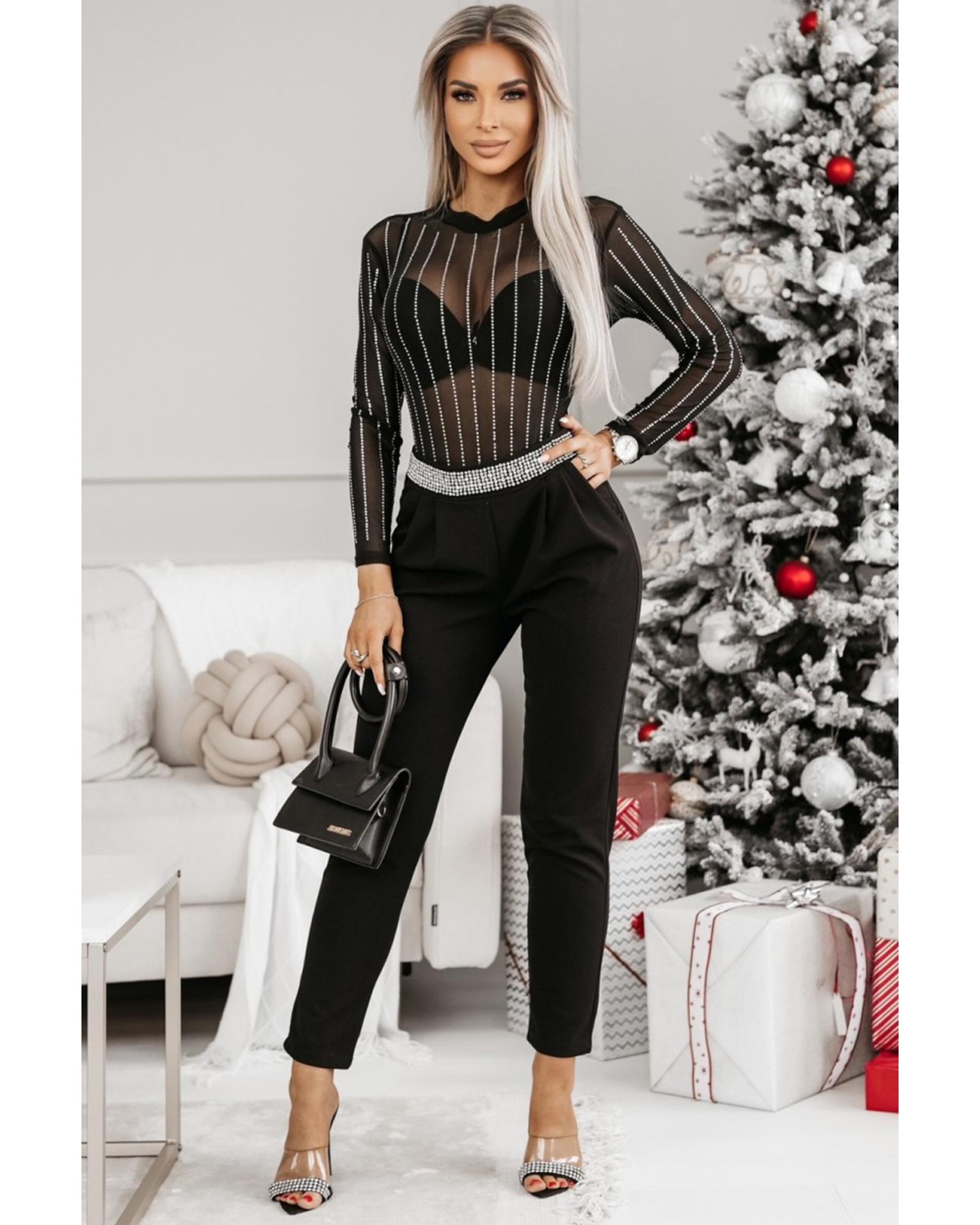 Black Rhinestone Decor Striped Mesh Long Sleeve Bodysuit – M