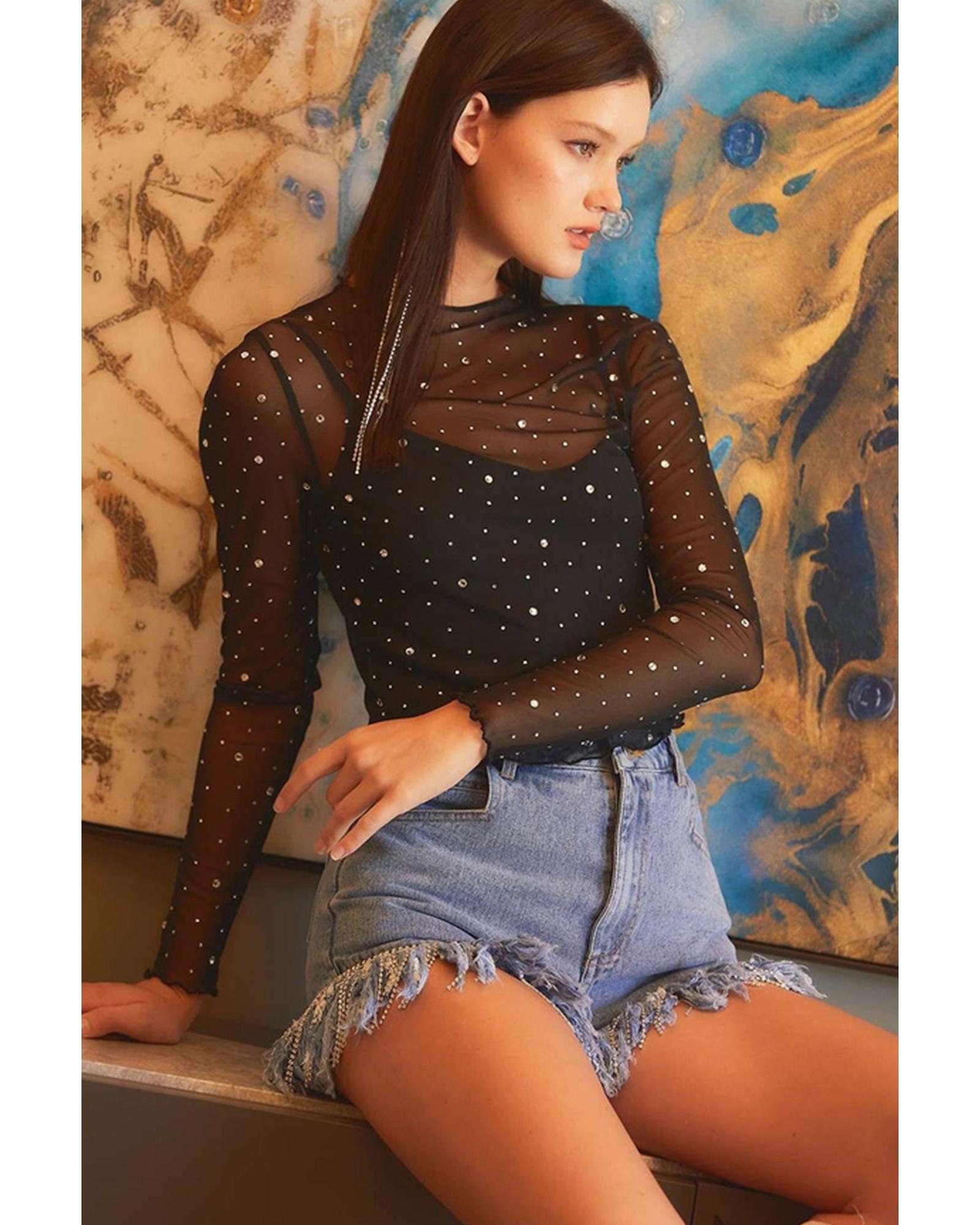 - Black Rhinestone Sheer Mesh Slim Fit Long Sleeve Top