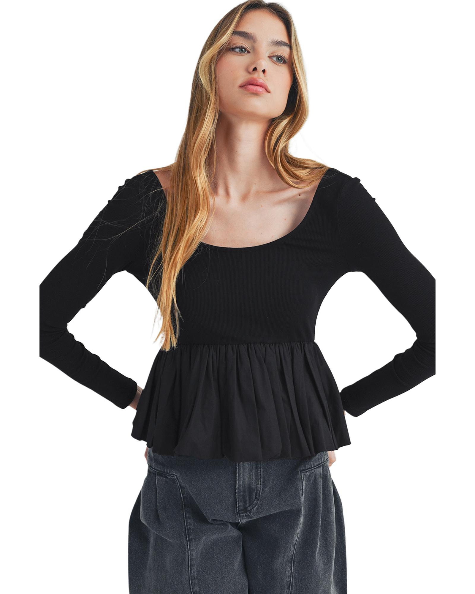 Black Ribbed Knit Long Sleeve Scoop Neck Peplum Patchwork Top – S