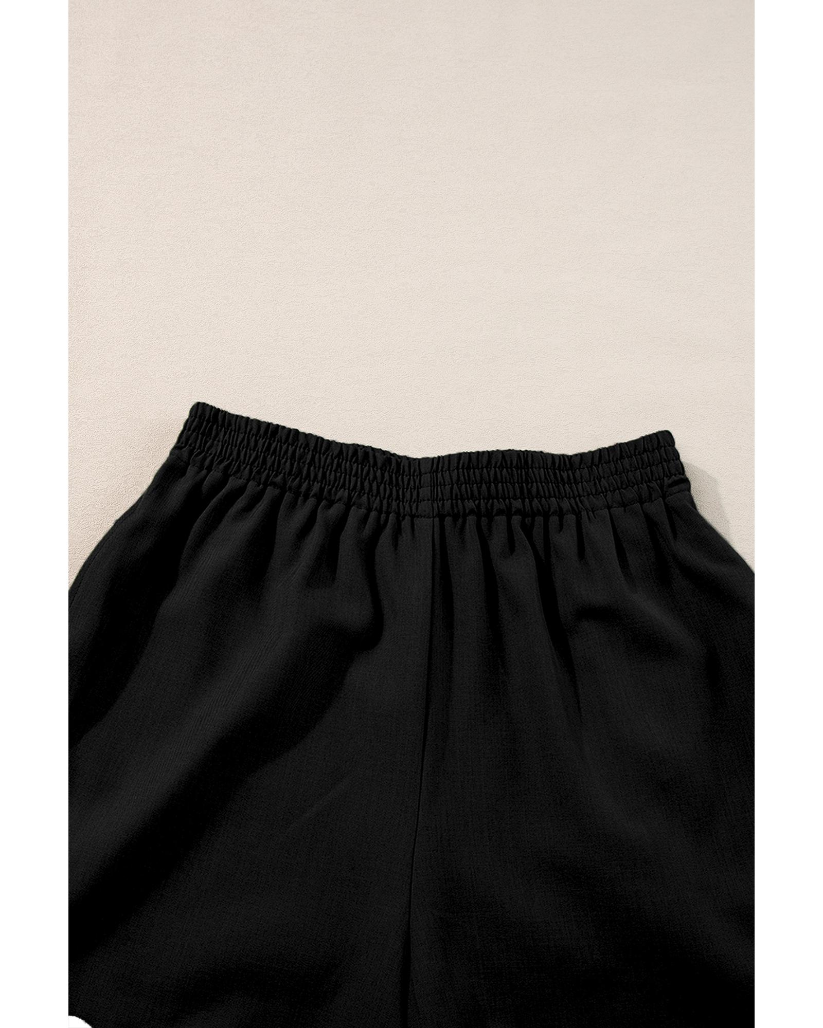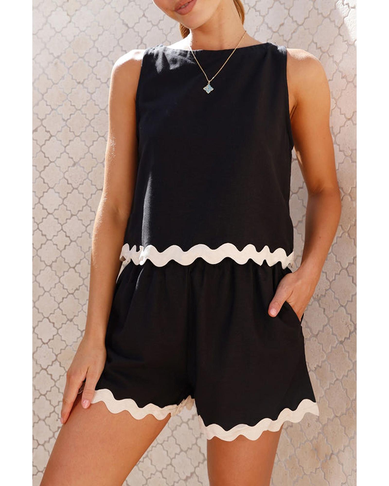 - Black Ricrac Trim Tank Top Elastic Waist Shorts Set