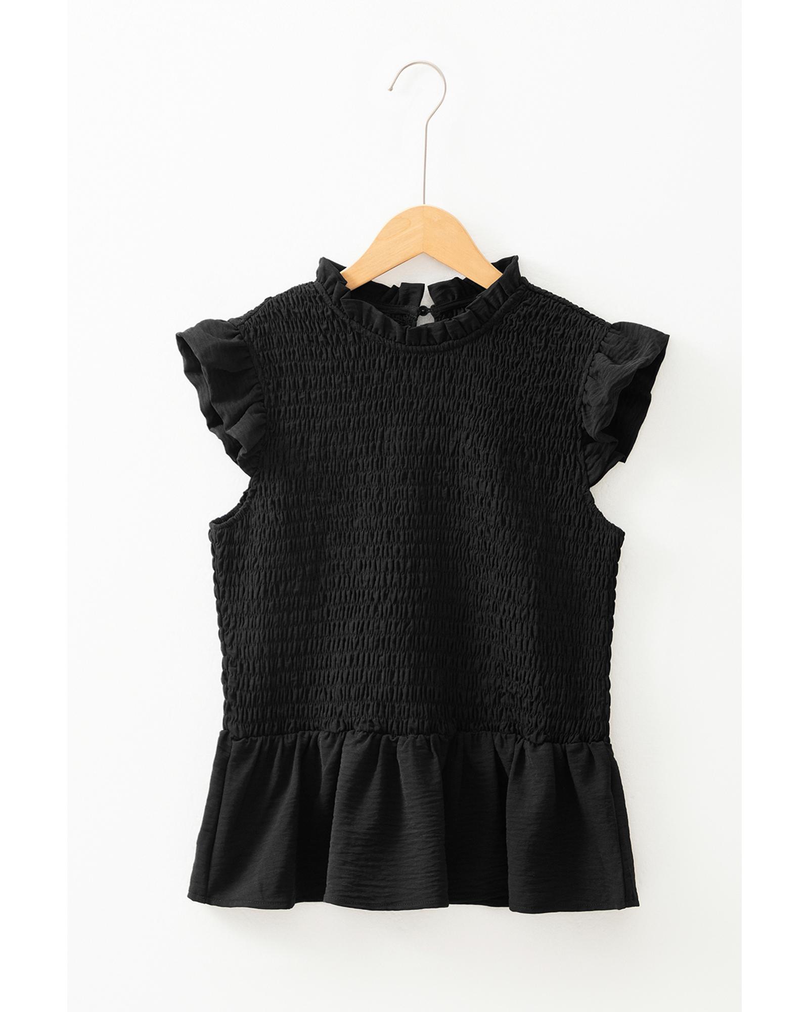 Black Ruffle Short Sleeve Shirred Peplum Top – L