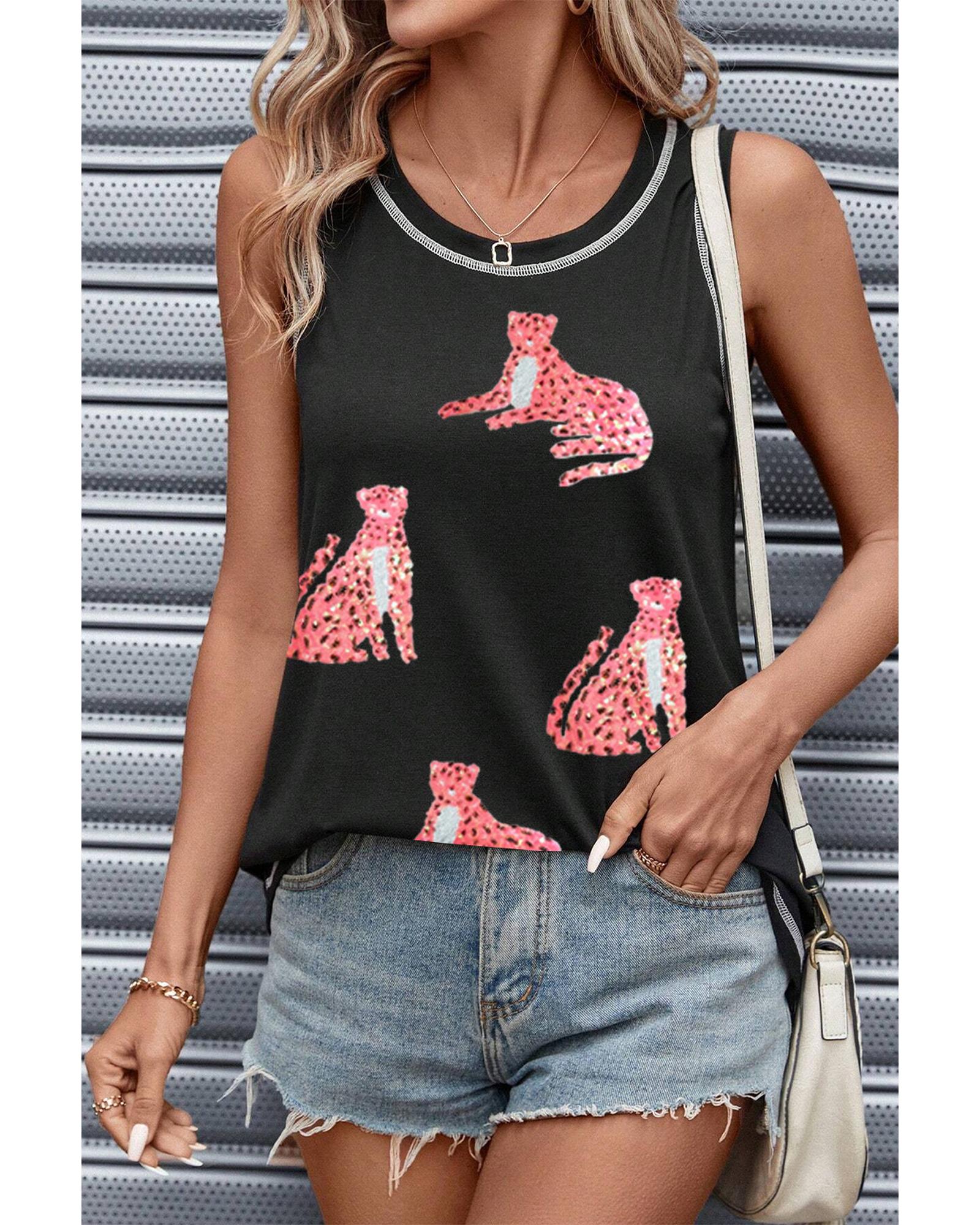 - Black Sequin Cheetah Round Neck Stitching Loose Tank Top
