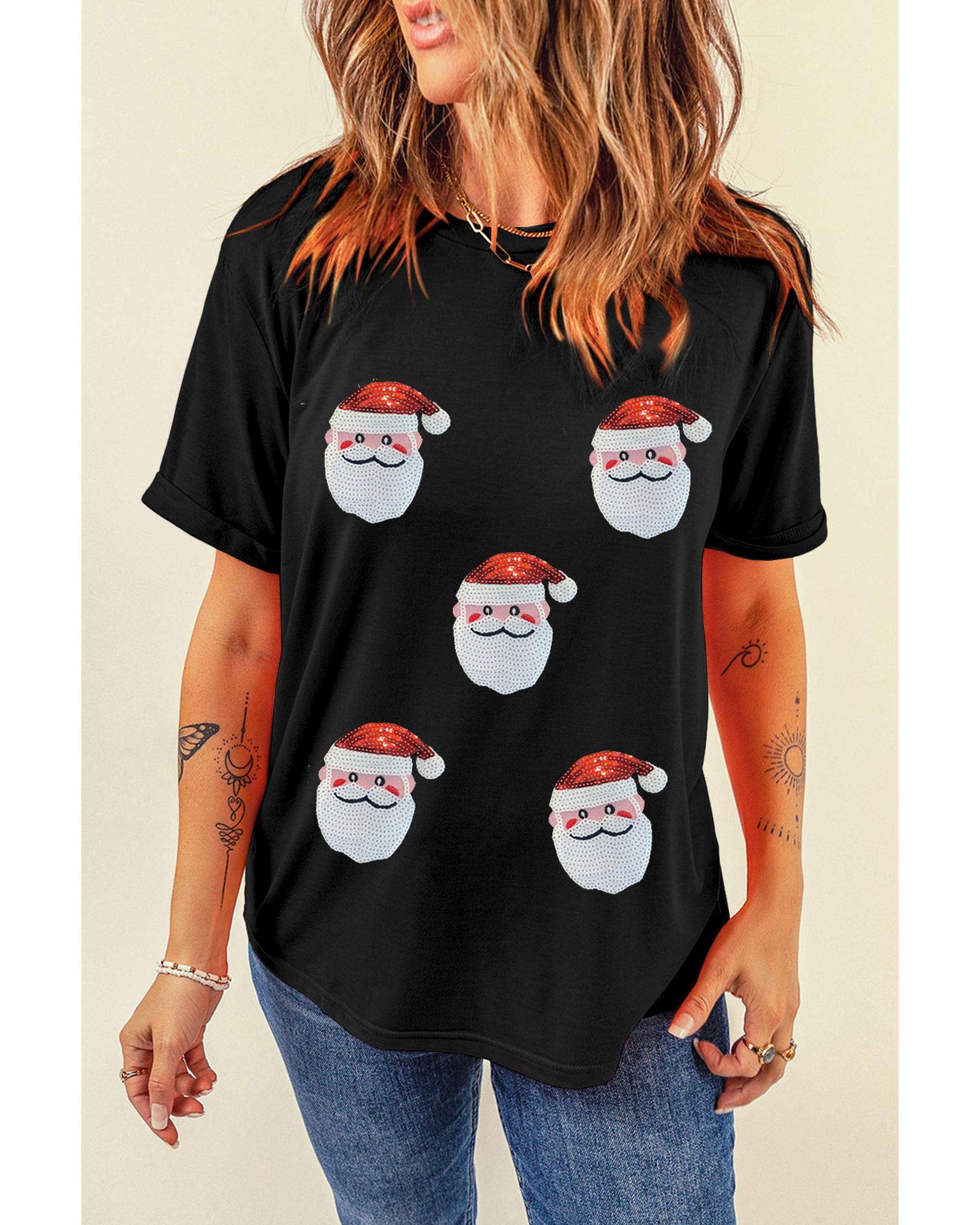 - Festive Black Sequin Christmas Claus Pattern Crewneck T Shirt