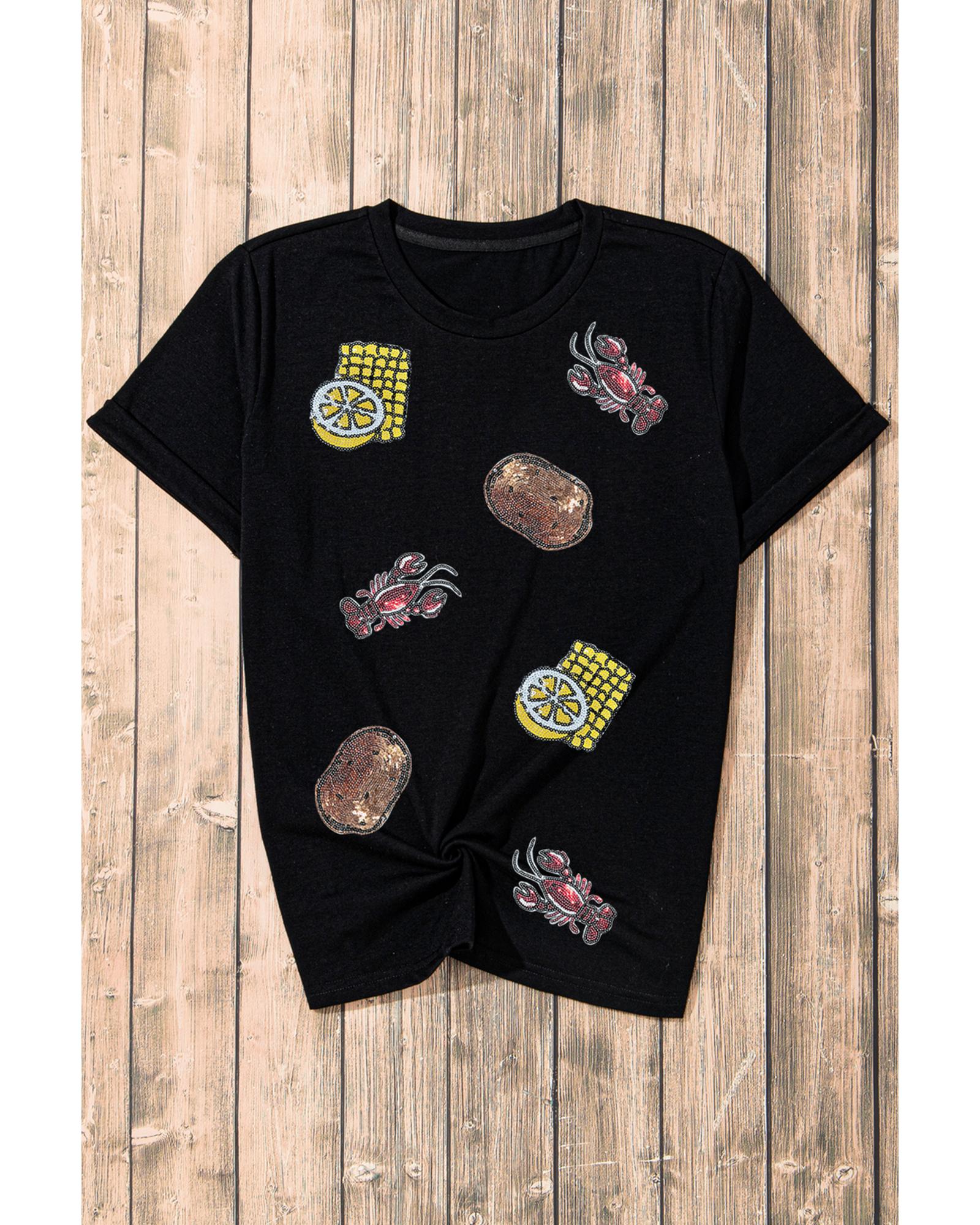 Black Sequin Crawfish Potato Lemon Corn Graphic Crewneck T Shirt – 2XL