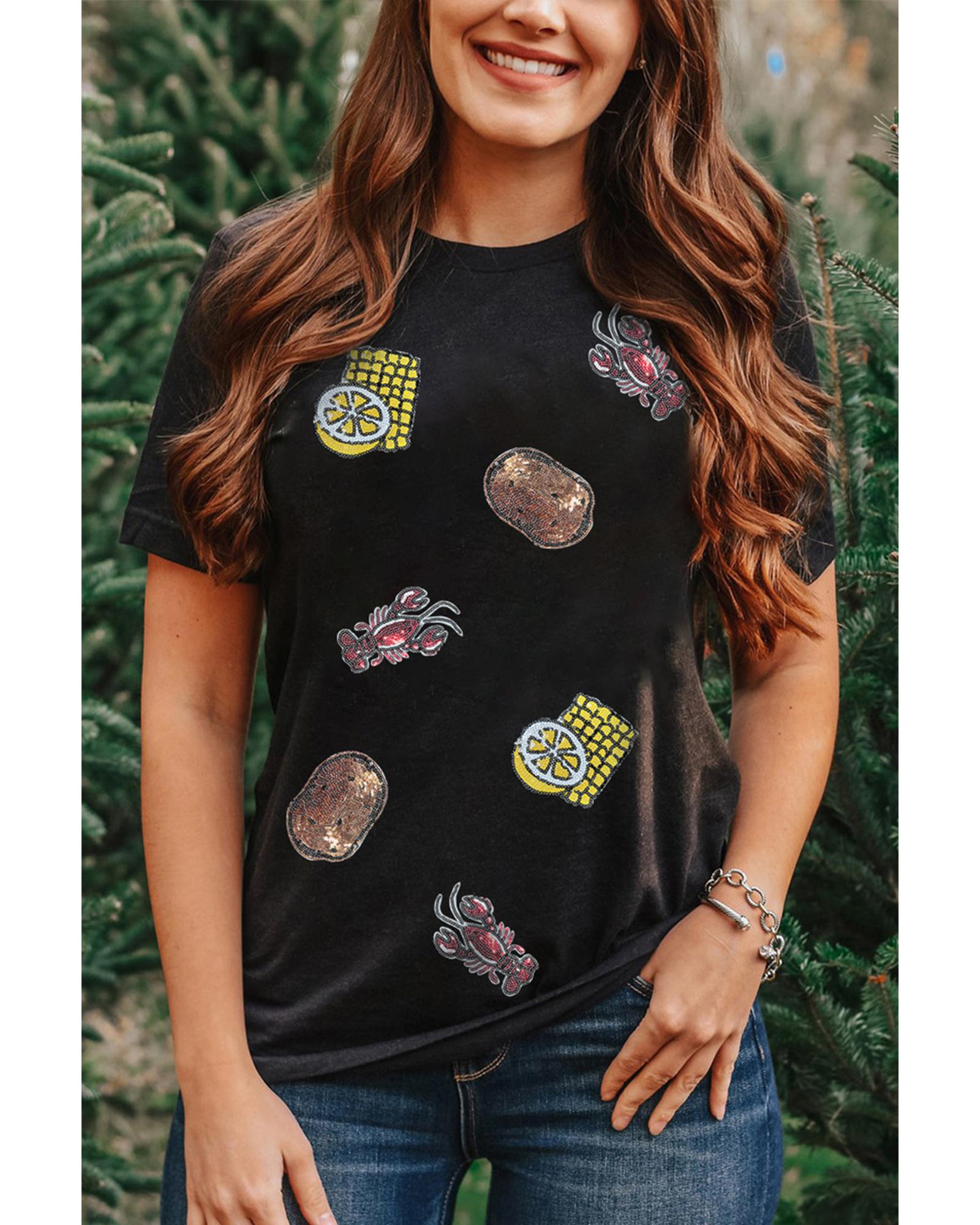 Black Sequin Crawfish Potato Lemon Corn Graphic Crewneck T Shirt – M