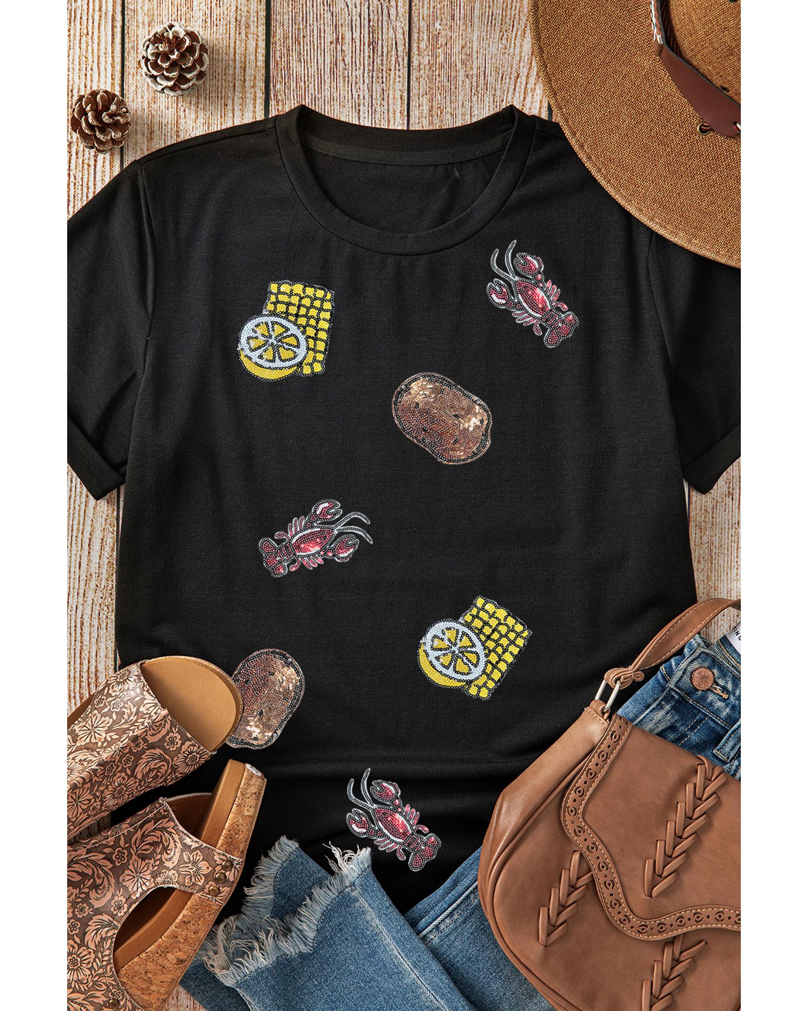 Black Sequin Crawfish Potato Lemon Corn Graphic Crewneck T Shirt – S
