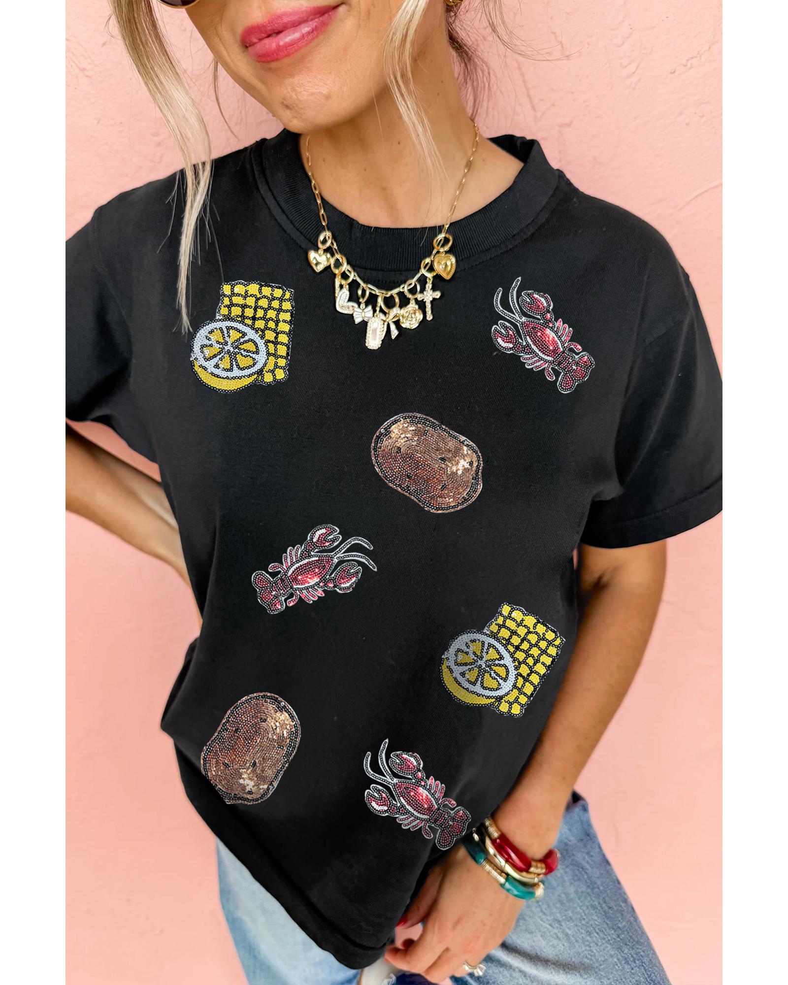 Black Sequin Crawfish Potato Lemon Corn Graphic Crewneck T Shirt – XL