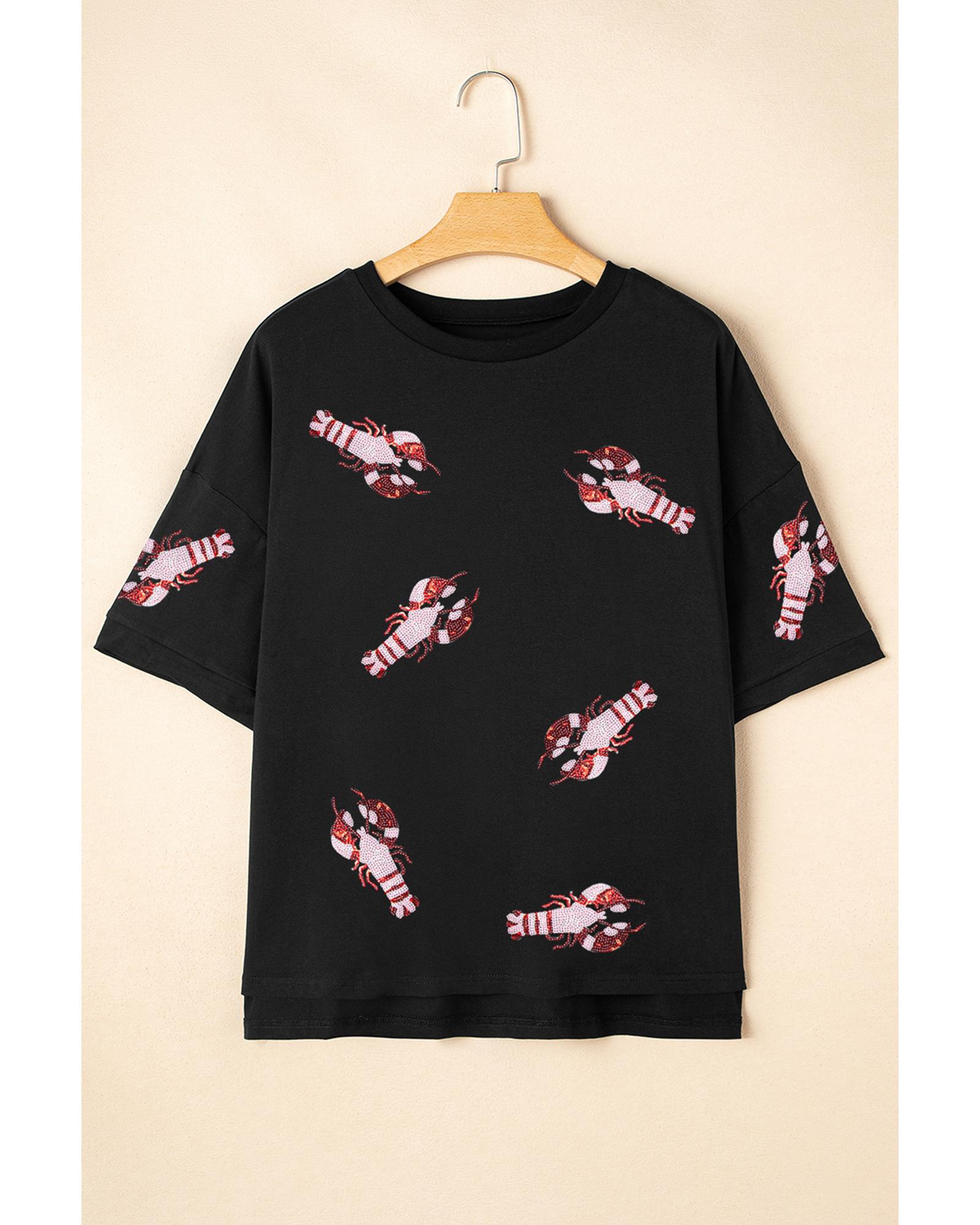 Black Sequin Crayfish Graphic Drop Sleeve High Low Tee – M