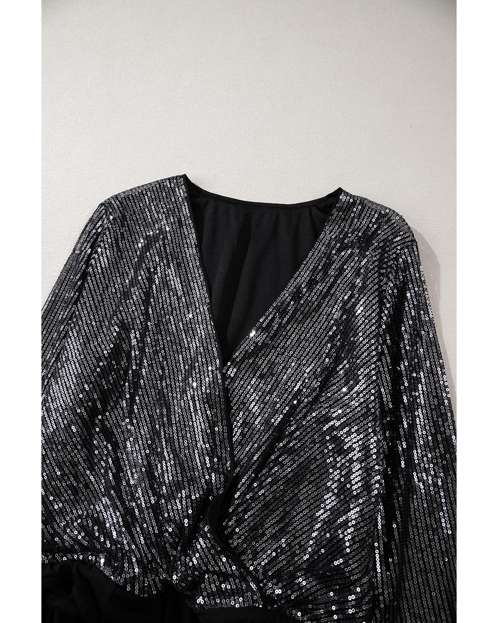 - Black Sequin Mesh Long Sleeve Surplice Neck Bodysuit