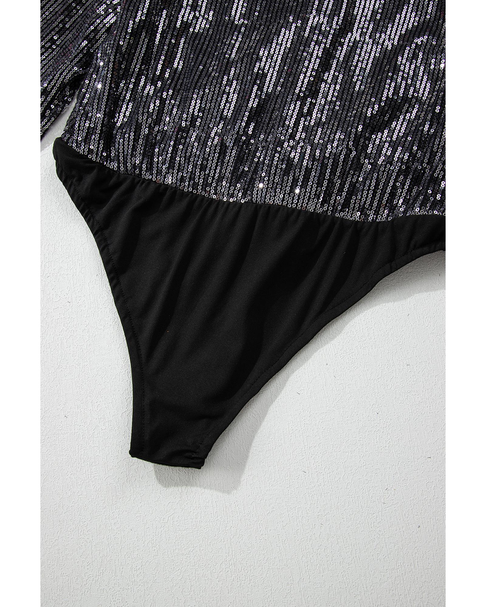 - Black Sequin Mesh Long Sleeve Surplice Neck Bodysuit