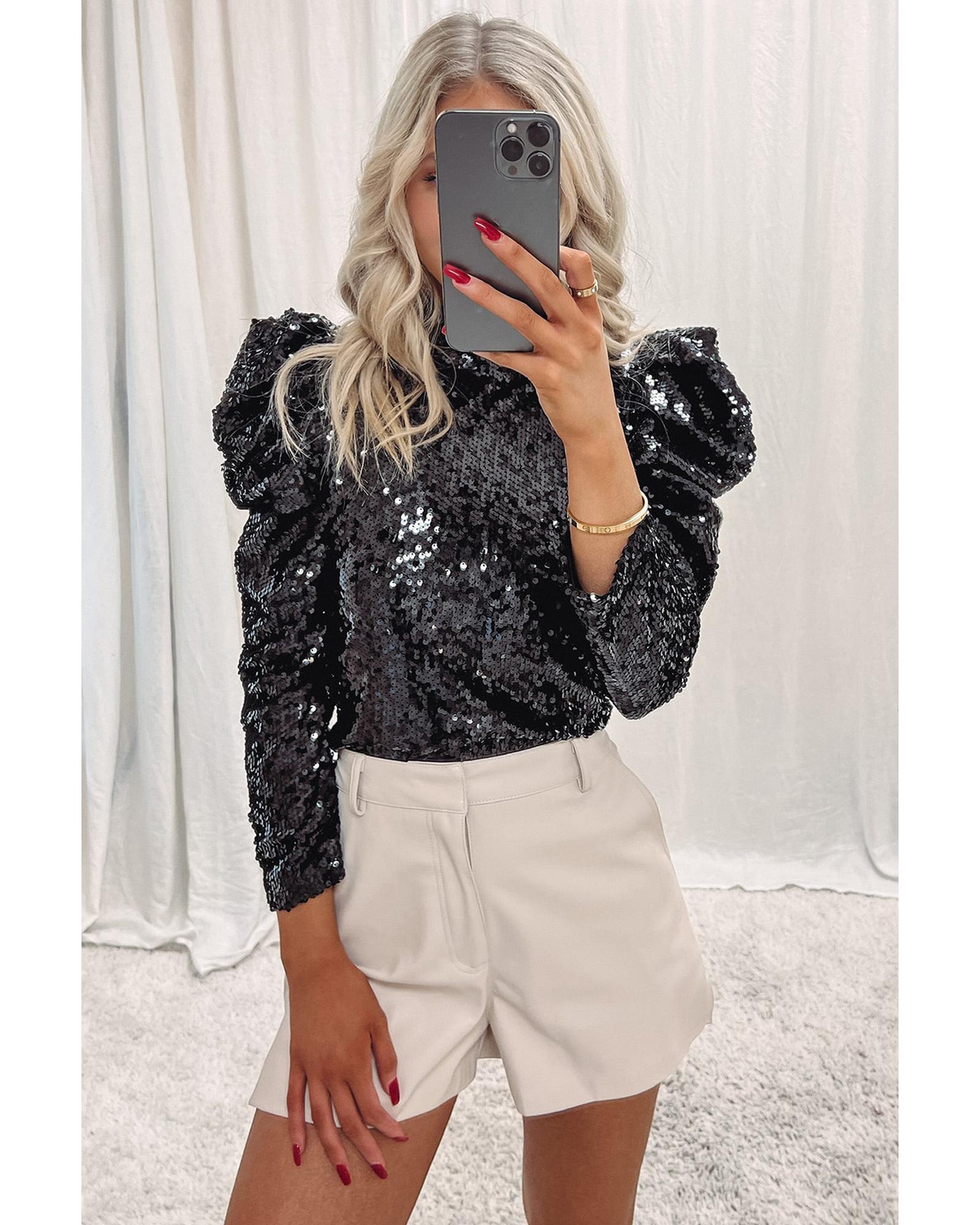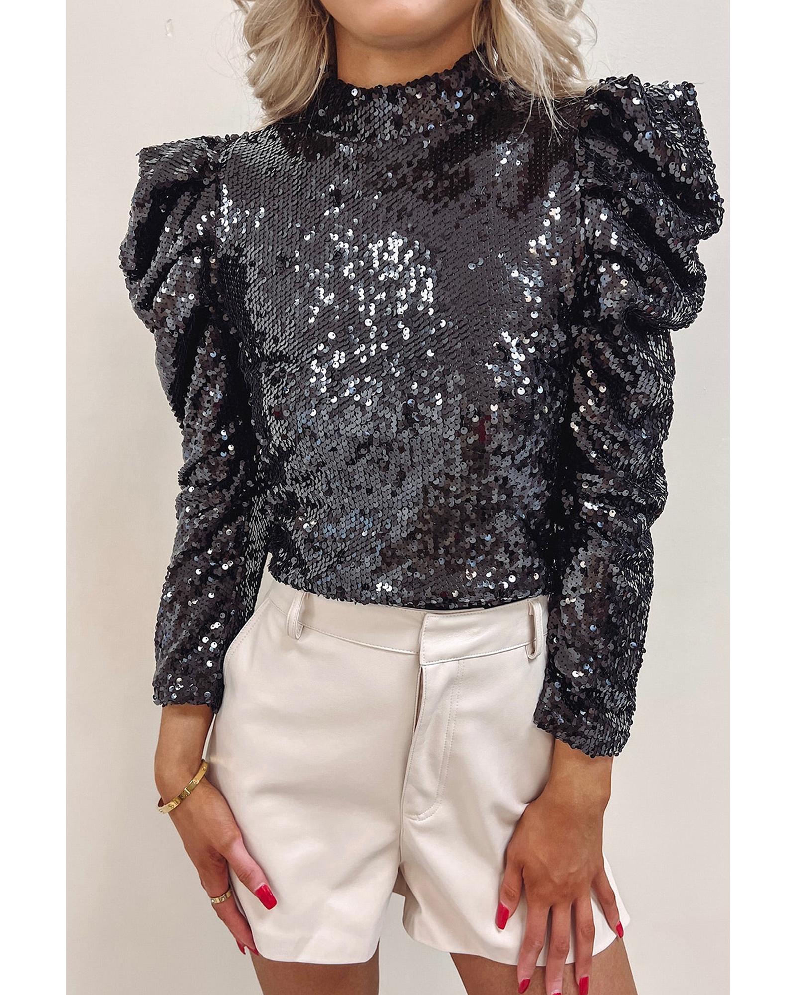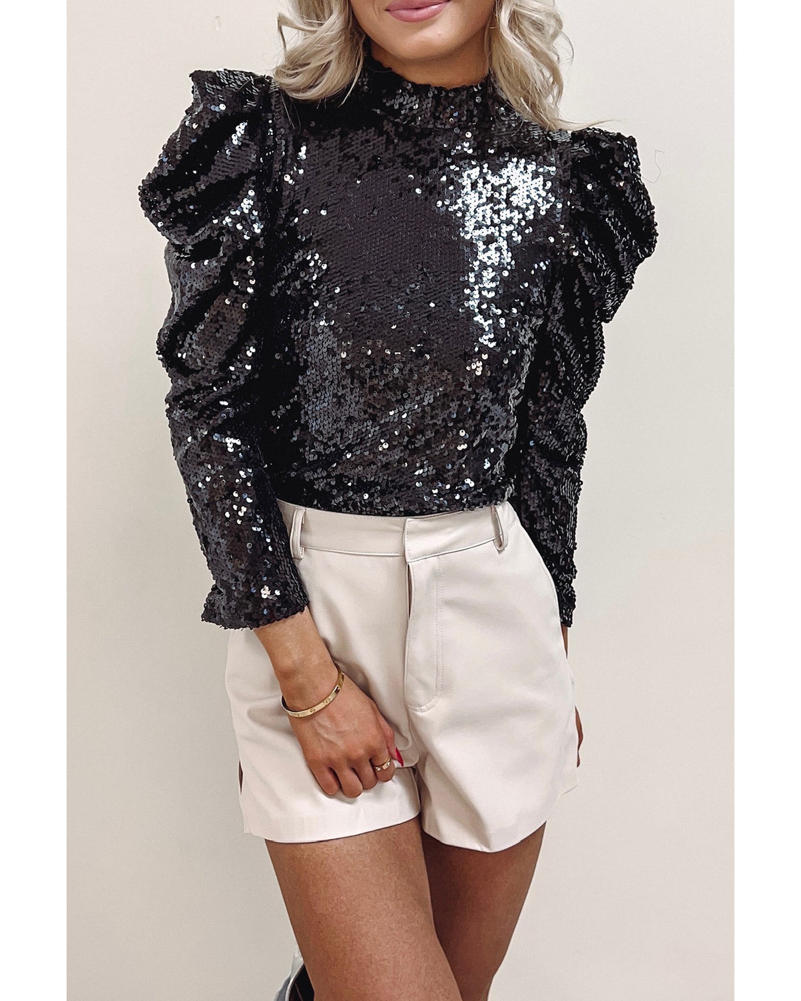• Black Sequin Mock Neck Bubble Sleeve Top