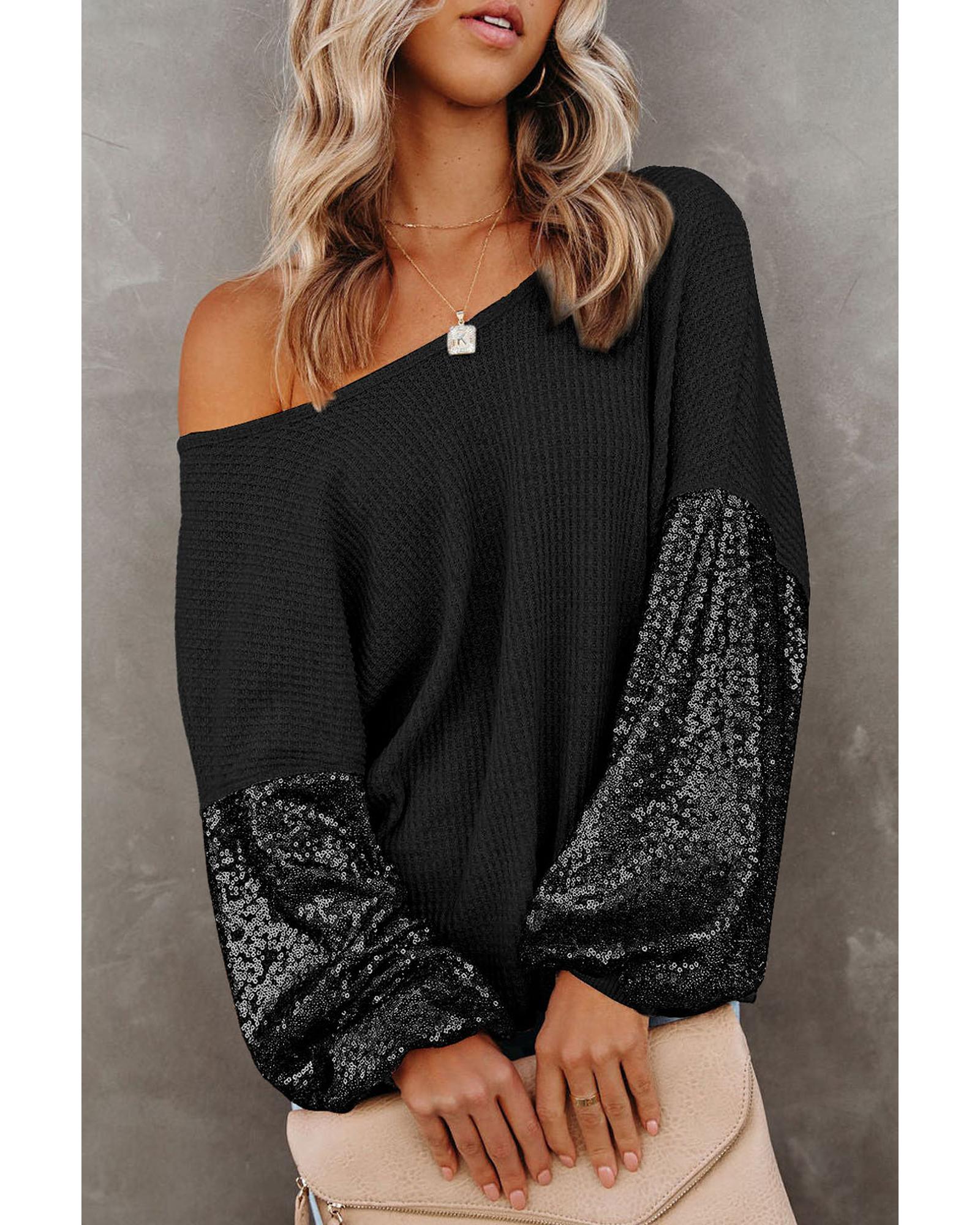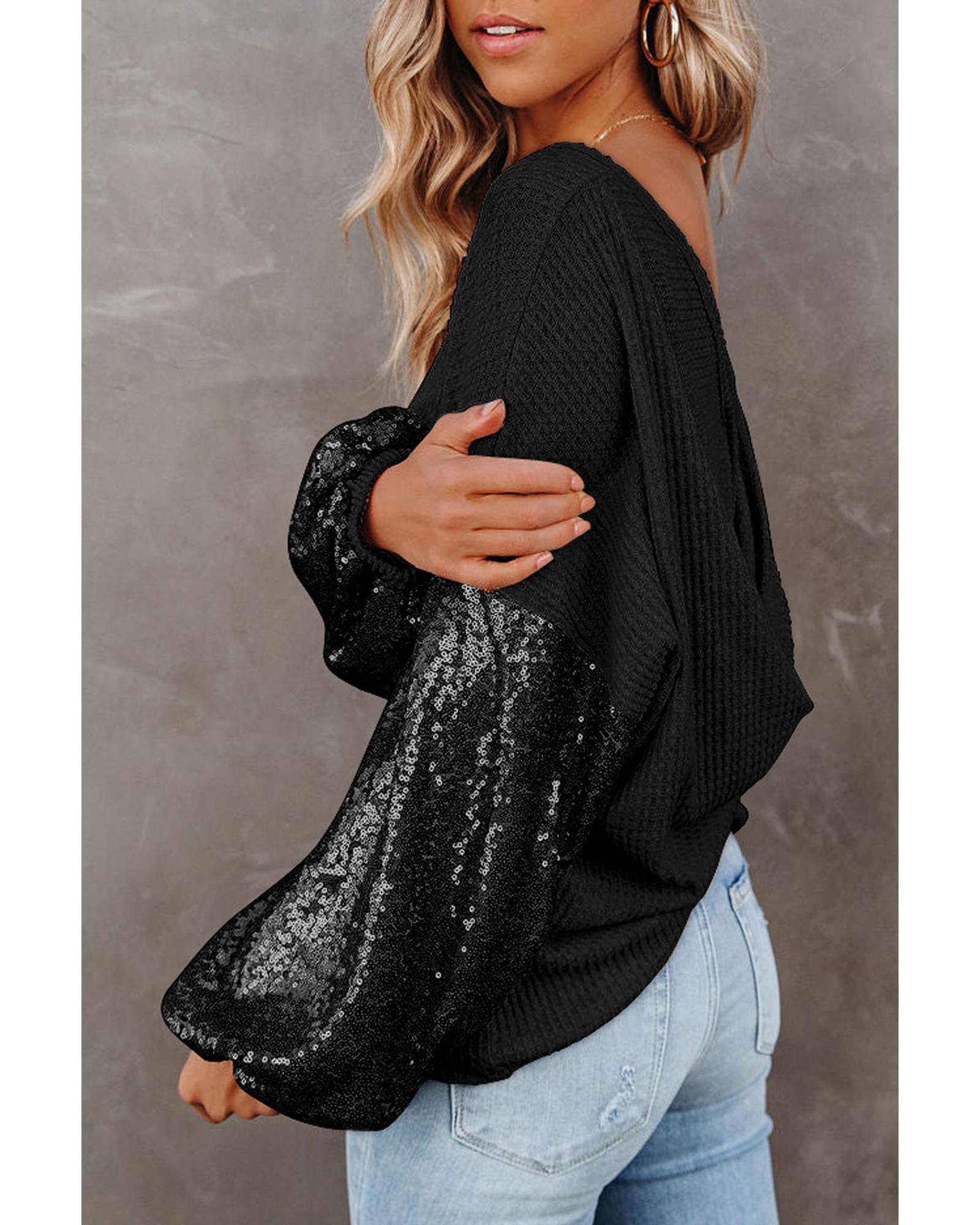 Black Sequin Patchwork Sleeve Open Back Waffle Knit Top – S