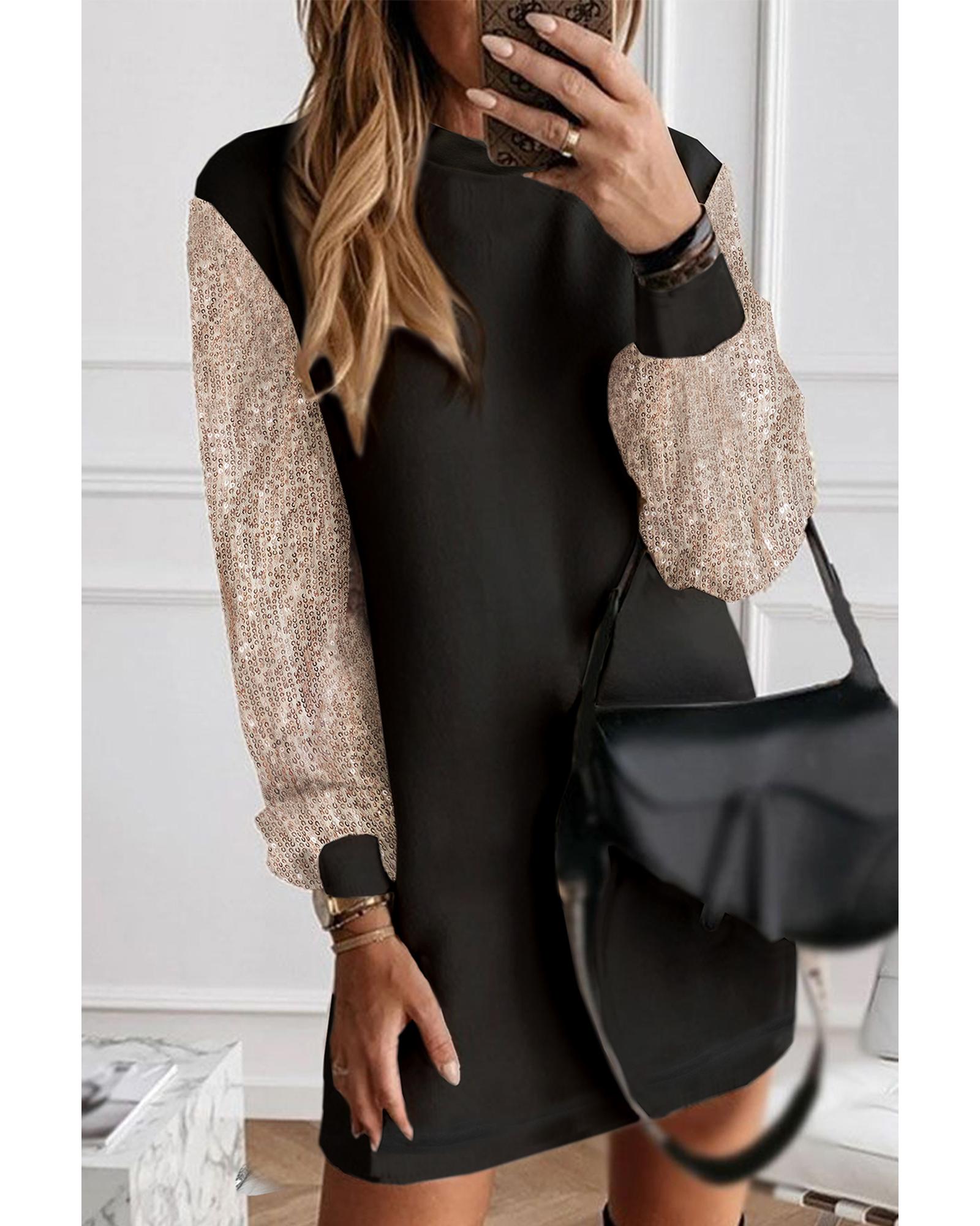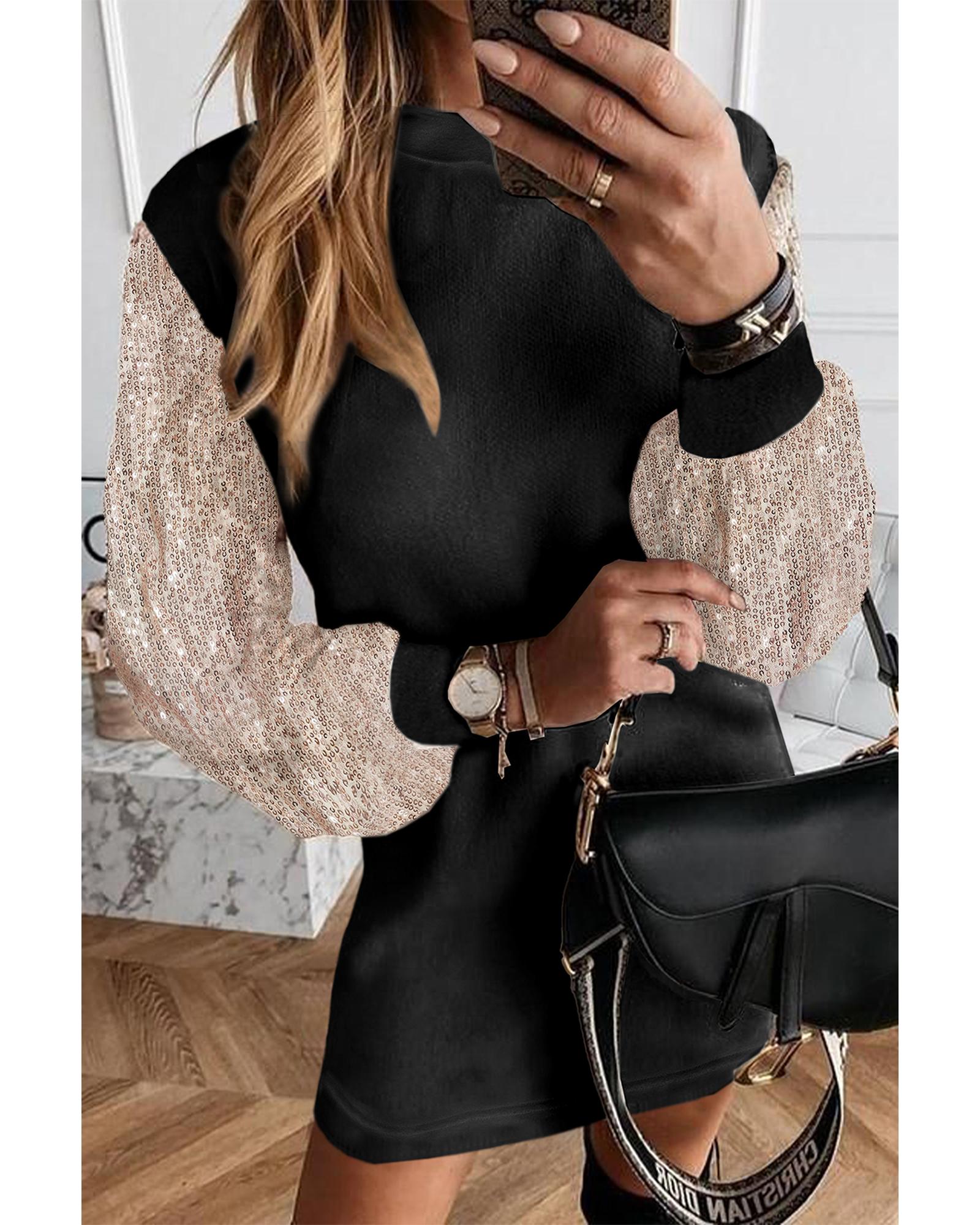 • Black Sequin Puff Sleeve Shift Mini Dress