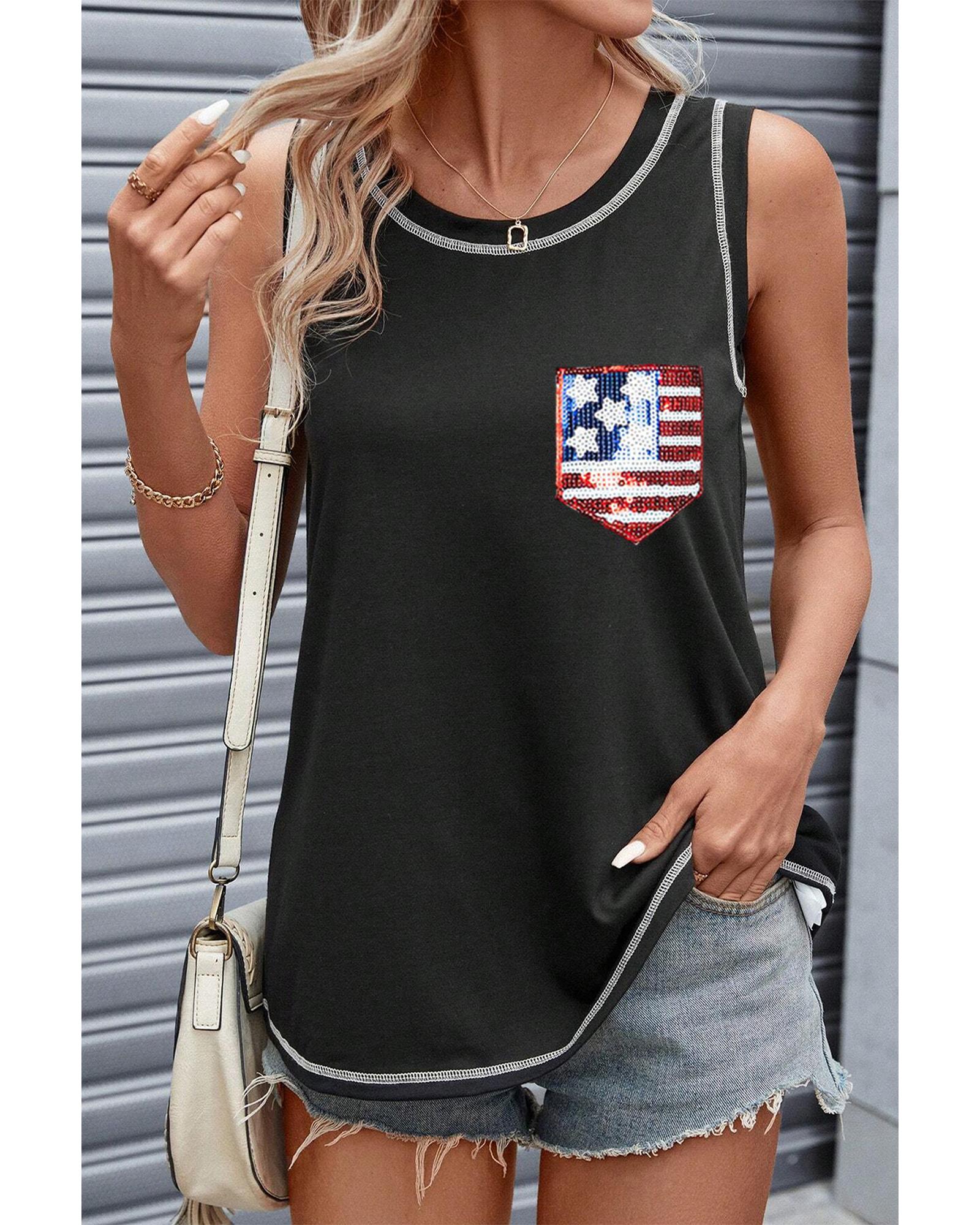 Black Sequined American Flag Patched Exposed Seam Tank Top – M