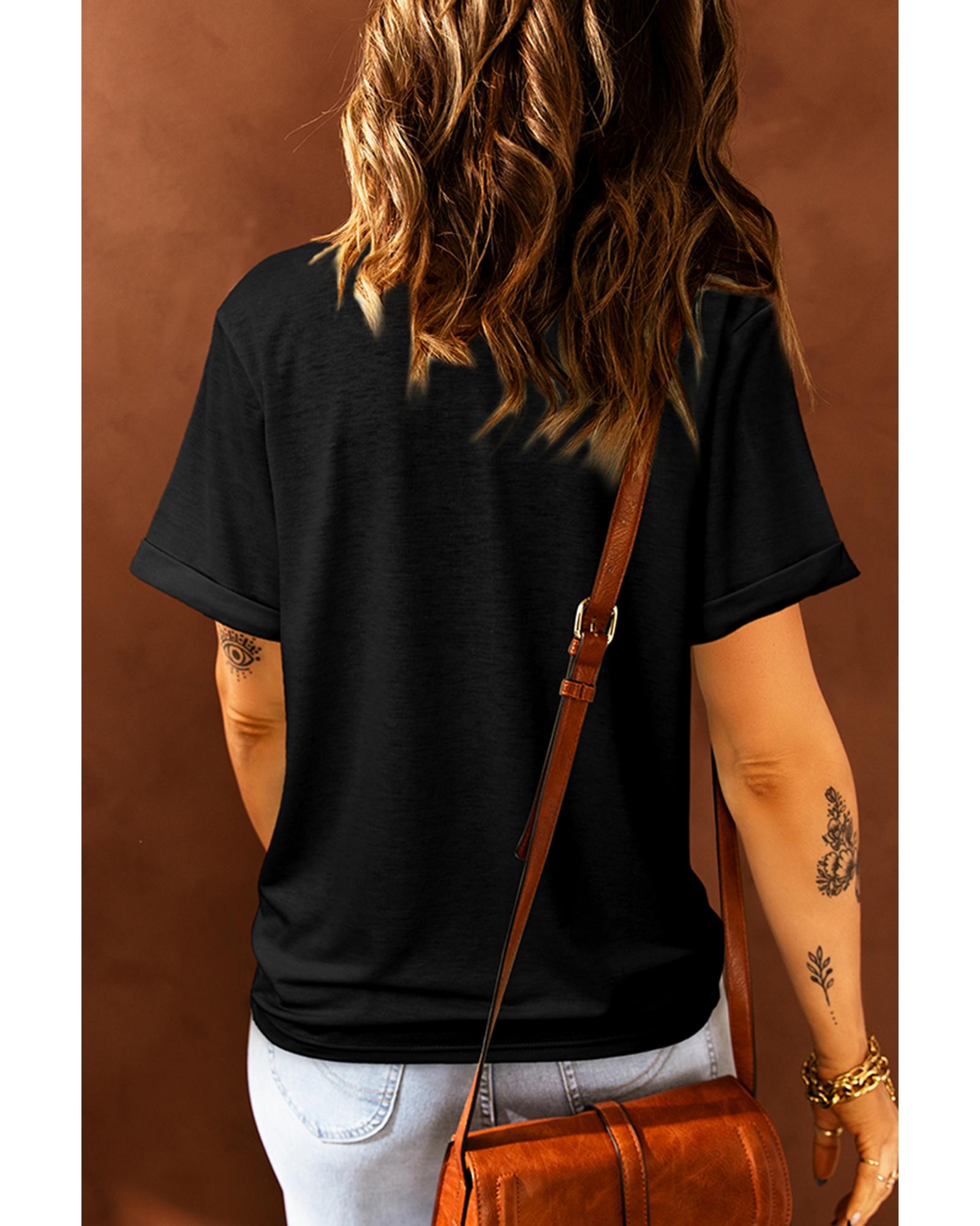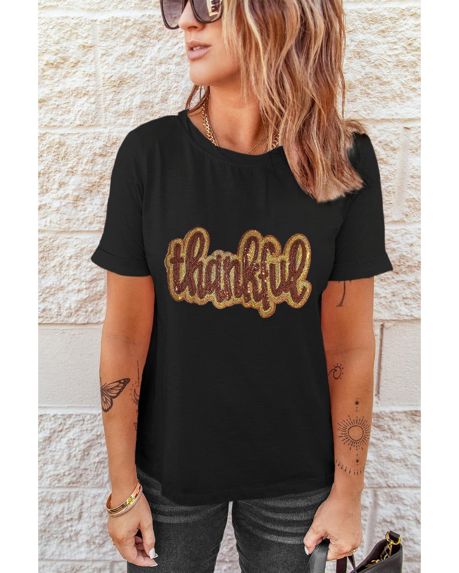 Black Sequined Thankful Round Neck Graphic Tee – L