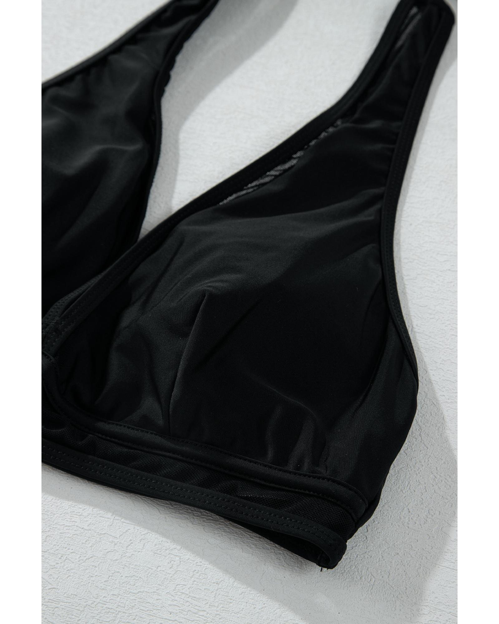 Black Sheer Mesh Edged Halter V Neck Push Up Bikini – L