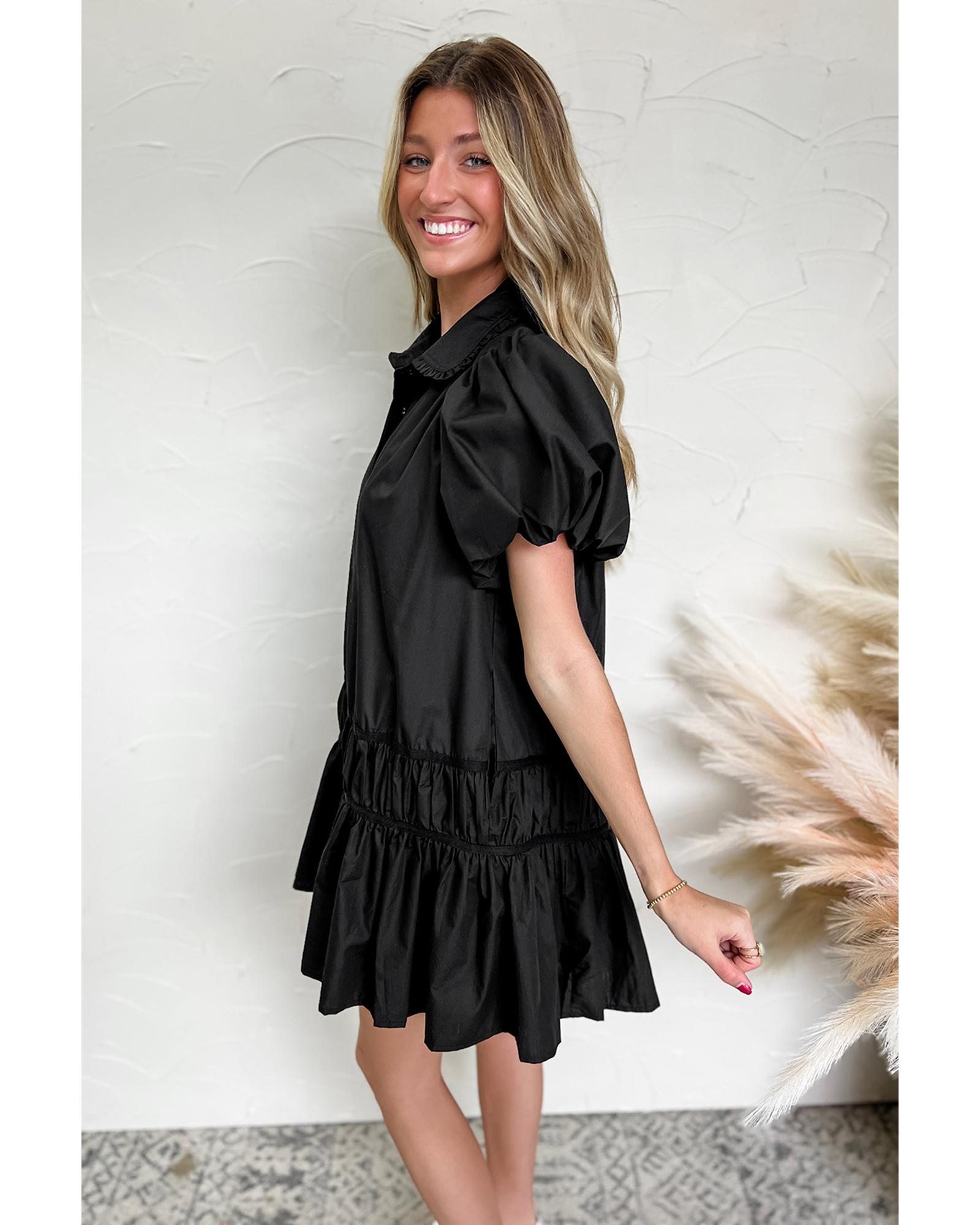 Black Shirt Style Button Down Puff Sleeve Ruffle Hem Dress – S