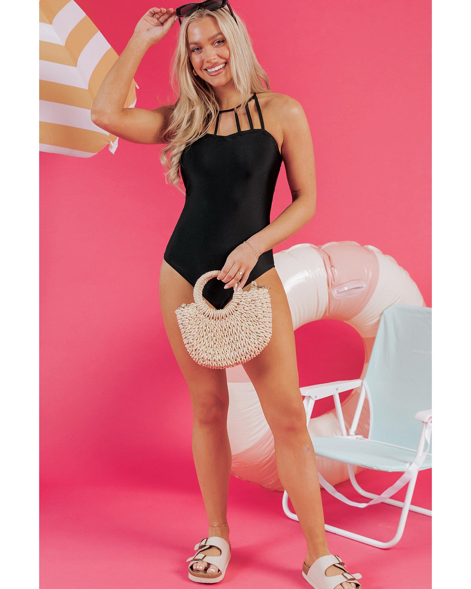 Black Sleeveless Strappy Halter Neck Sexy One Piece Swimsuit – S