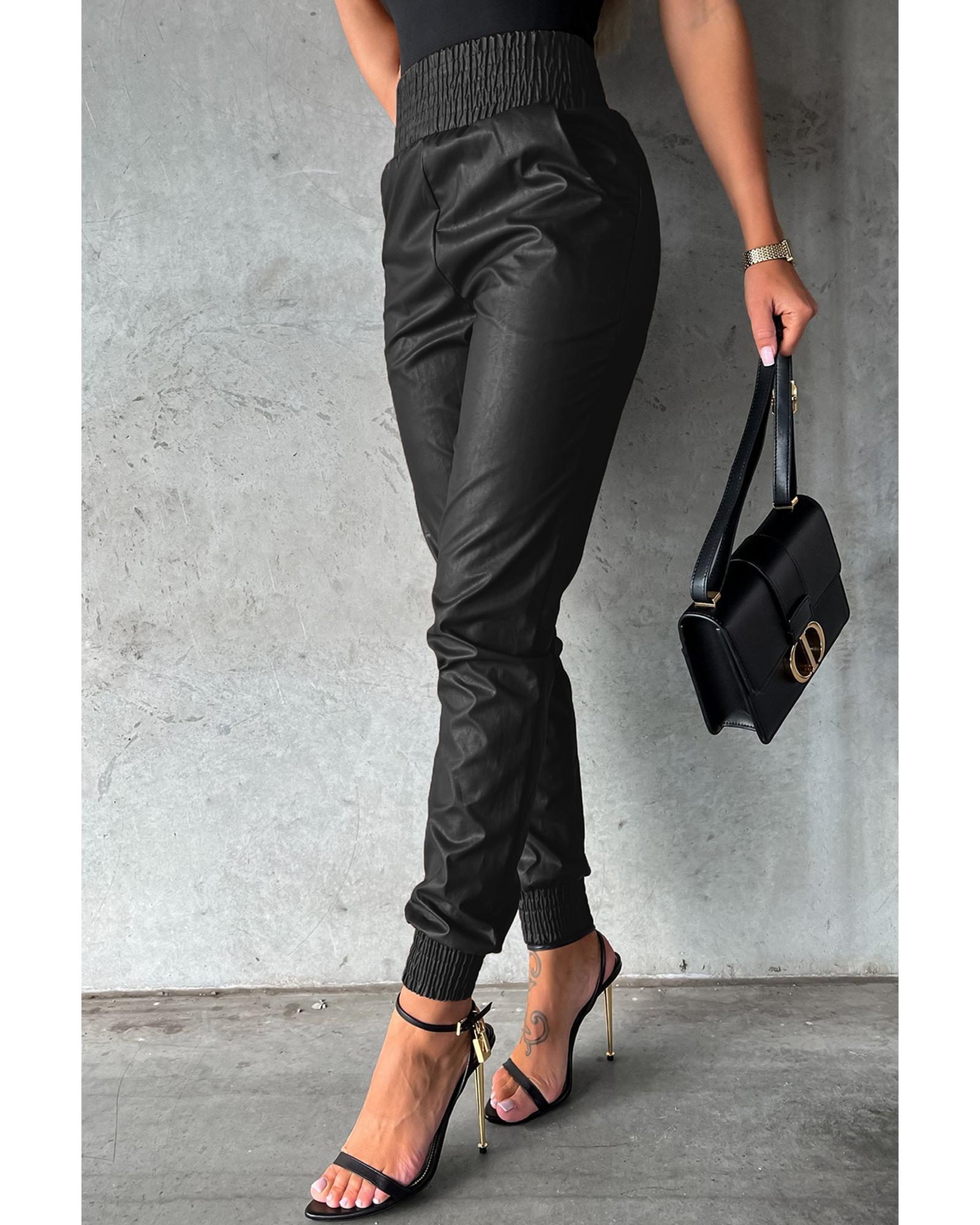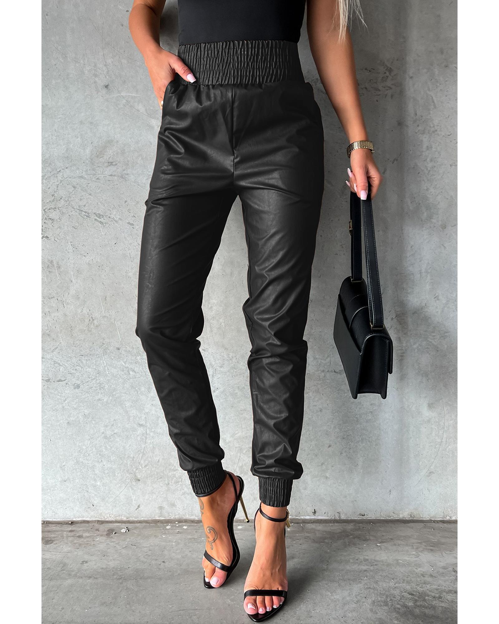 Black Smocked High-Waist Leather Skinny Pants – XL