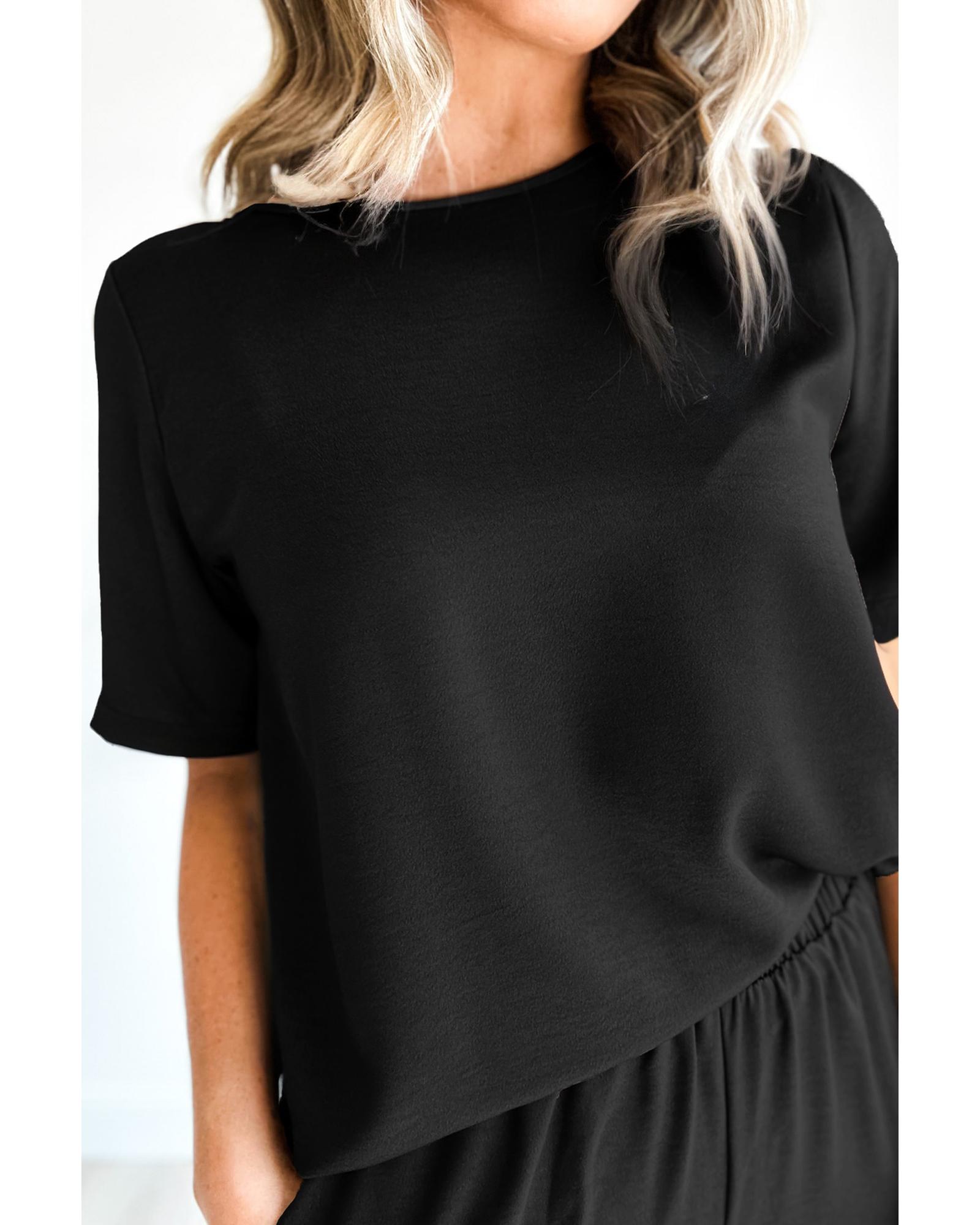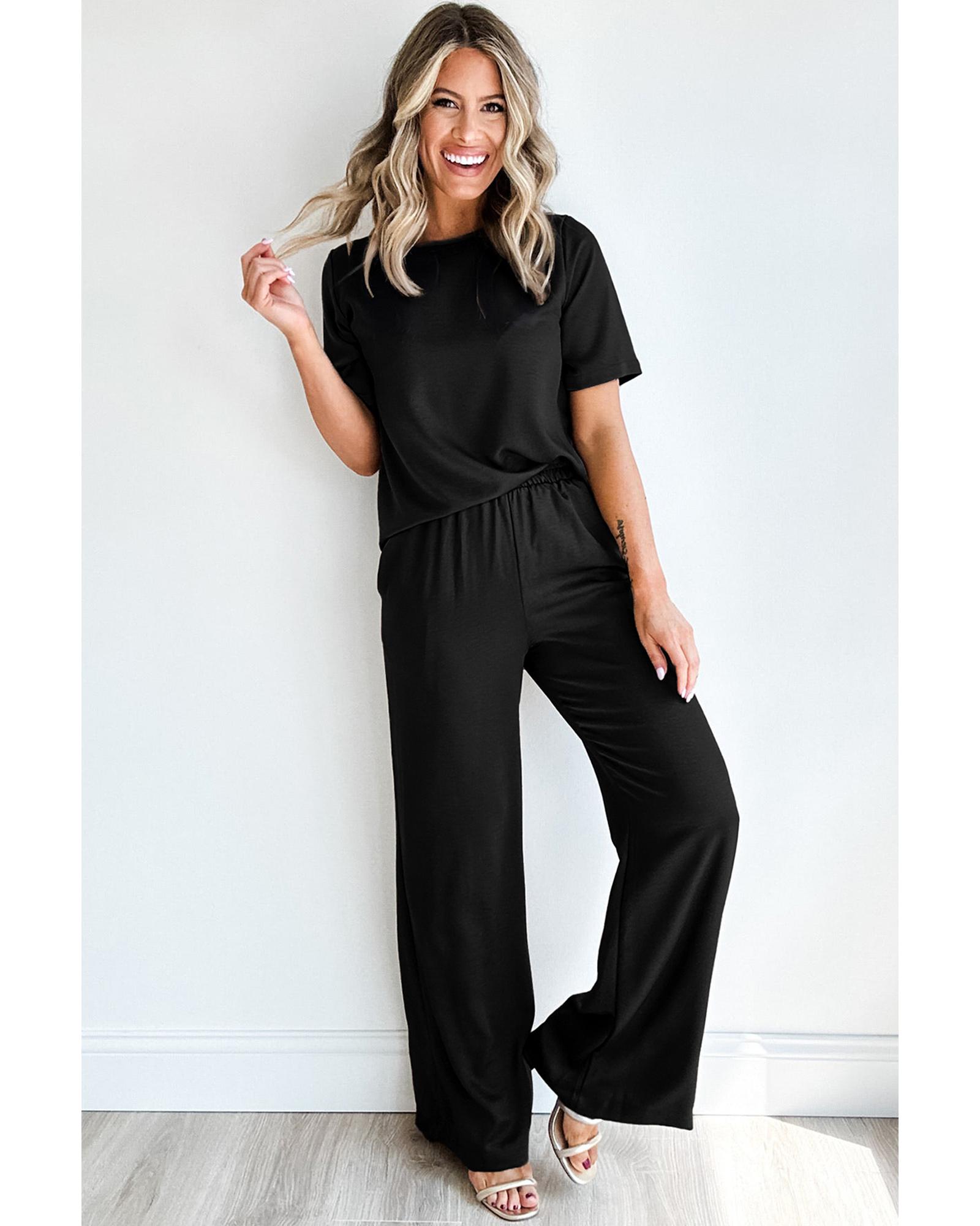 Black Solid Color T Shirt 2pcs Wide Leg Pants Set – S
