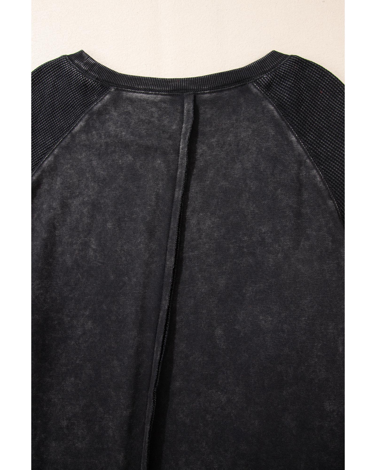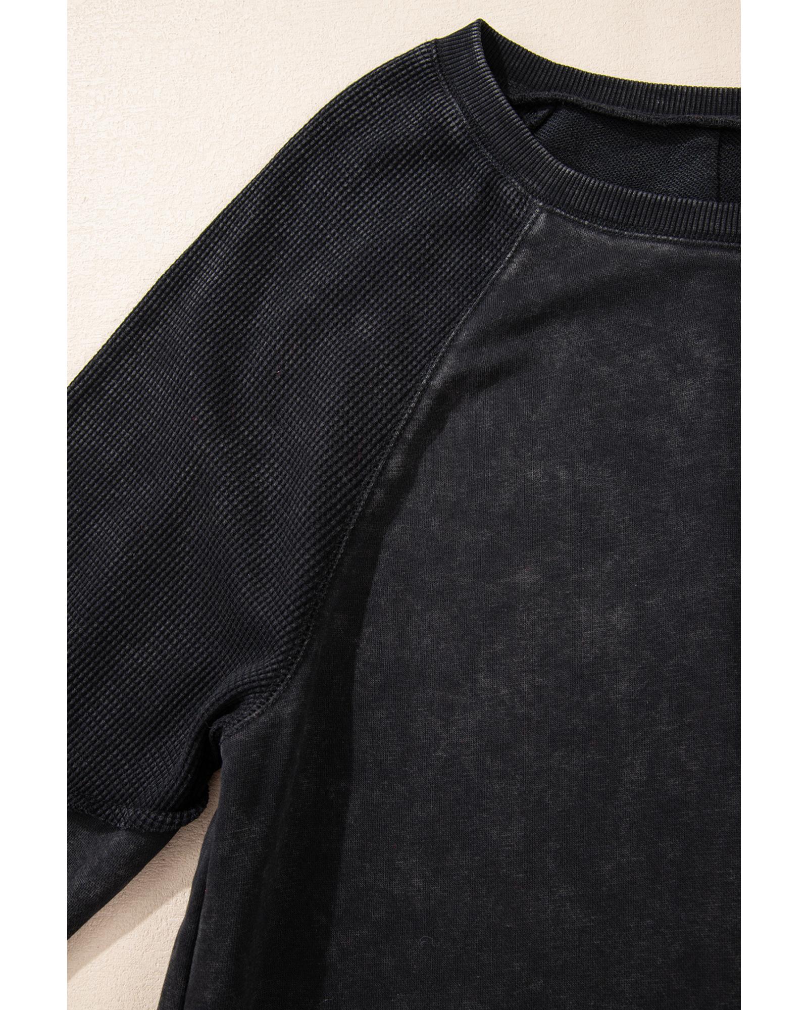 Black Solid Waffle Knit Patchwork Raglan Sleeve Sweatshirt – L