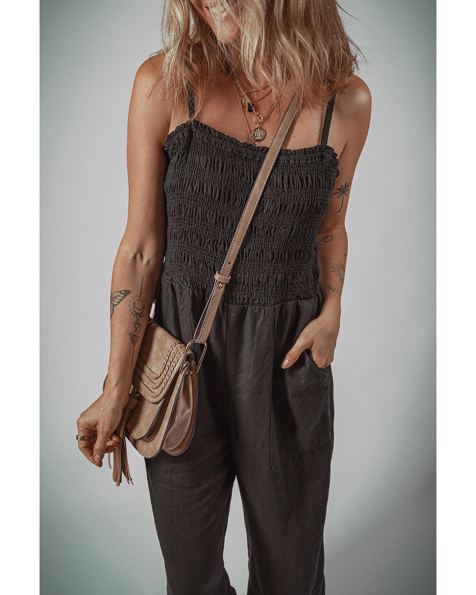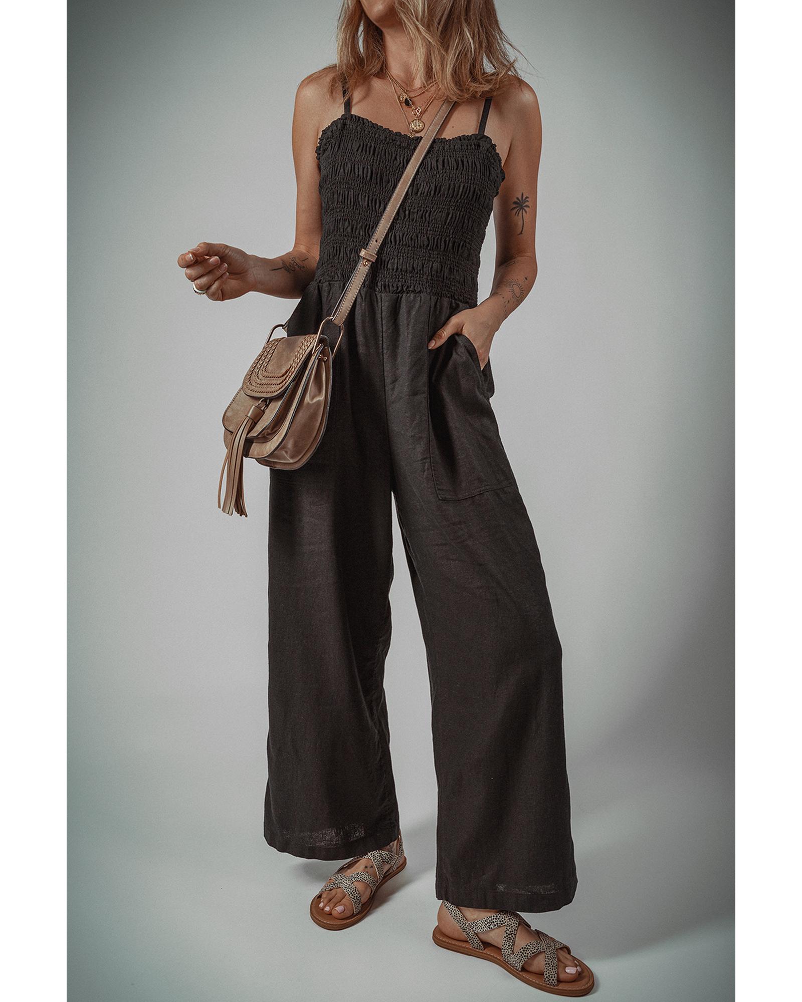 Black Spaghetti Straps Shirred Bodice Pocketed Wide Leg Jumpsuit – XL