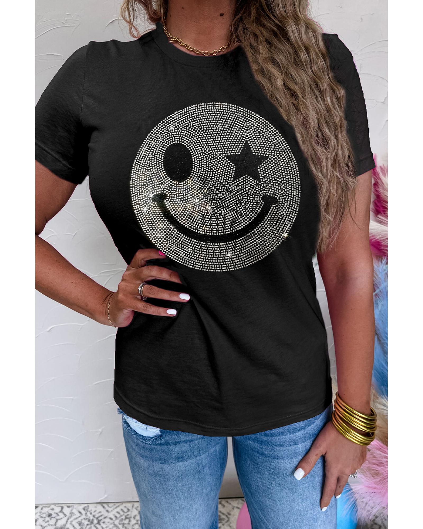 - Black Sparkle Rhinestone Smile Face Graphic T Shirt