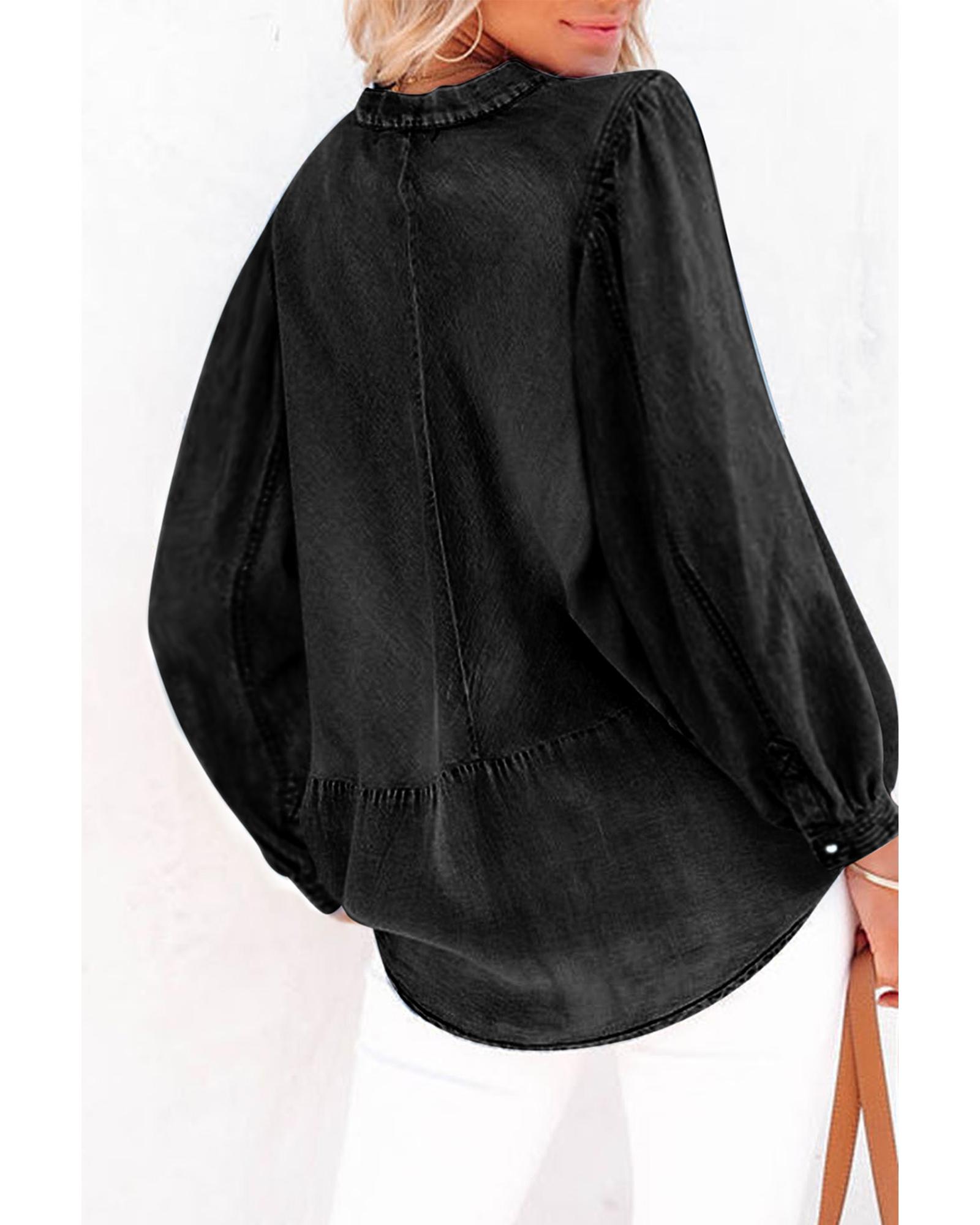 Black Split V-Neck Balloon Sleeve Ruched Denim Top – XL