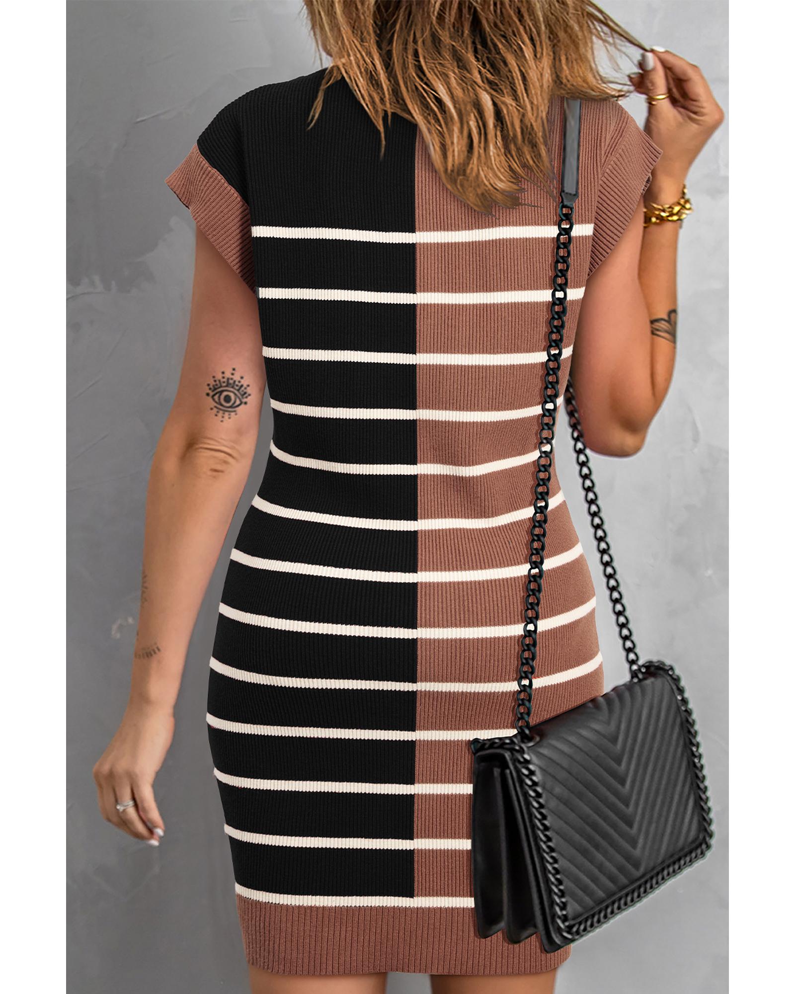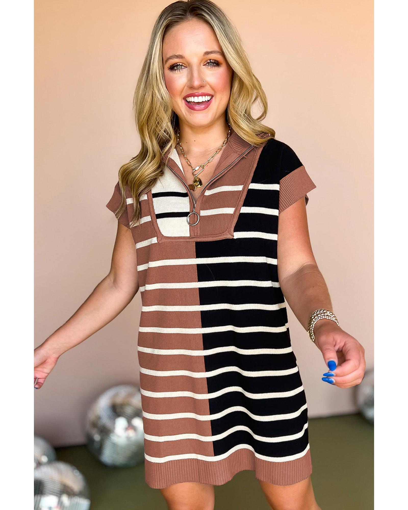 Black Stripe Color Block Quarter Zip Collar Short Sleeve Sweater Dress - L