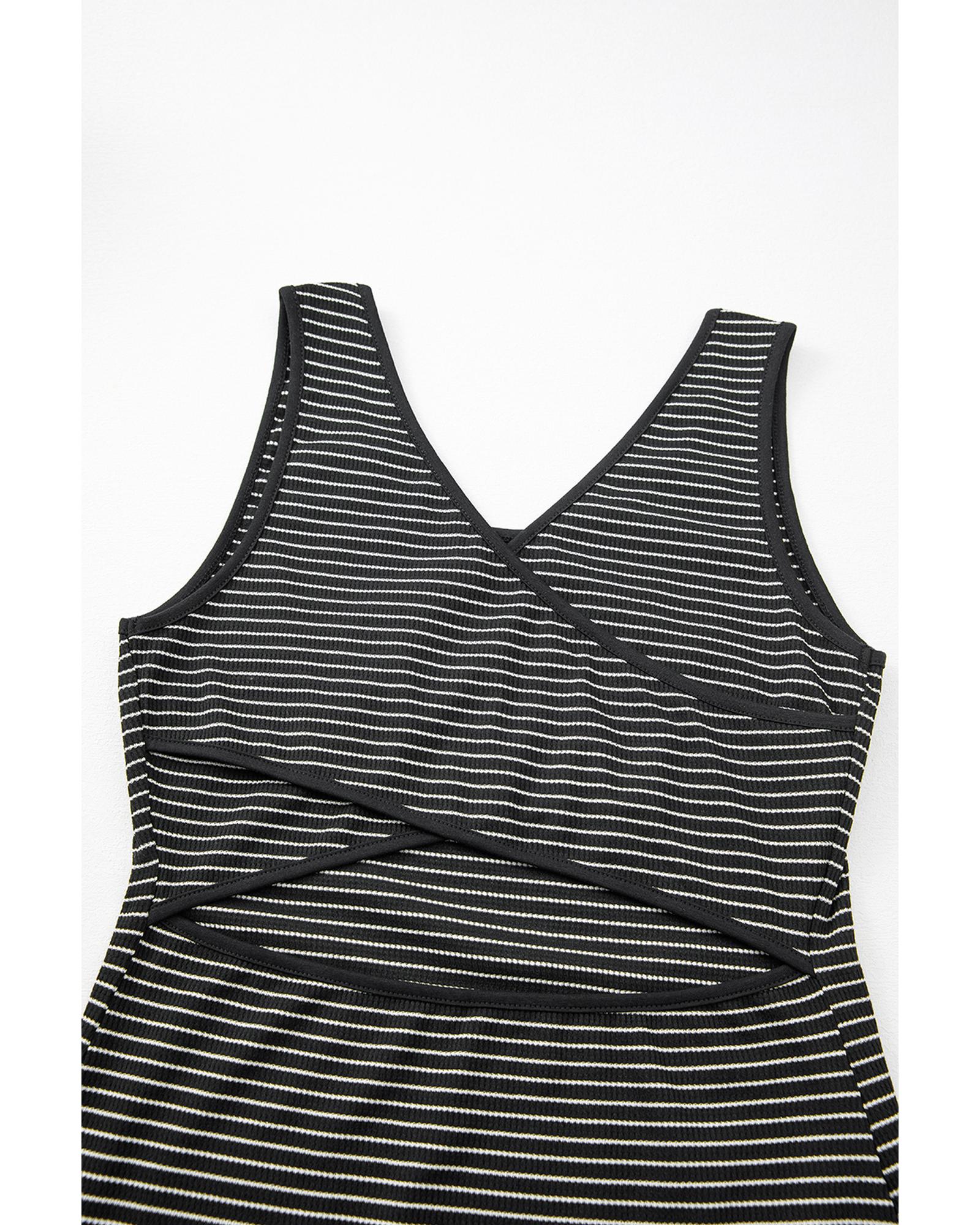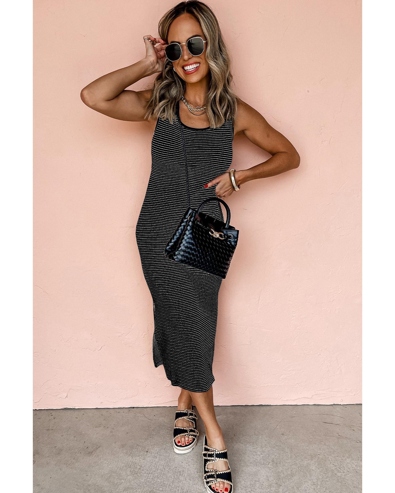 Black Stripe Criss Cross Side Slits Slim Fit Sleeveless Midi Dress – L