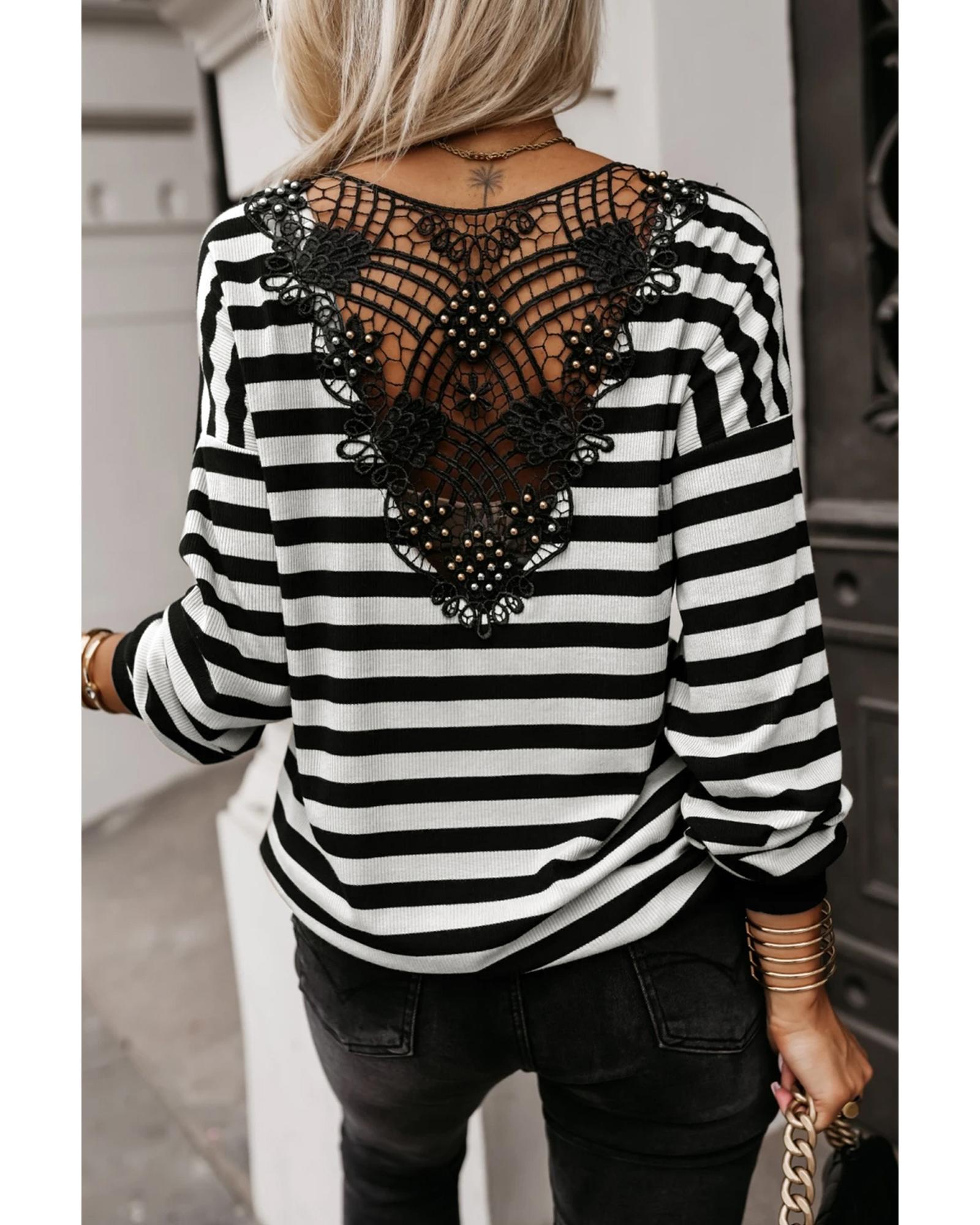 Black Stripe Crochet Hollow-out Back Buttoned Shoulder V Neck Top – L