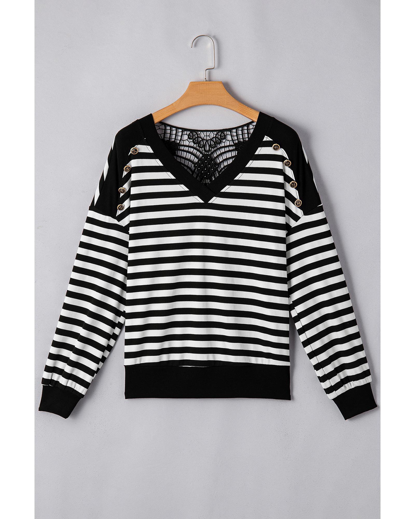 Black Stripe Crochet Hollow-out Back Buttoned Shoulder V Neck Top – M