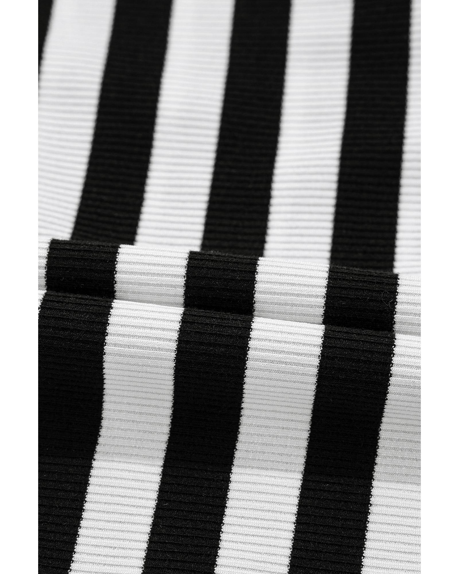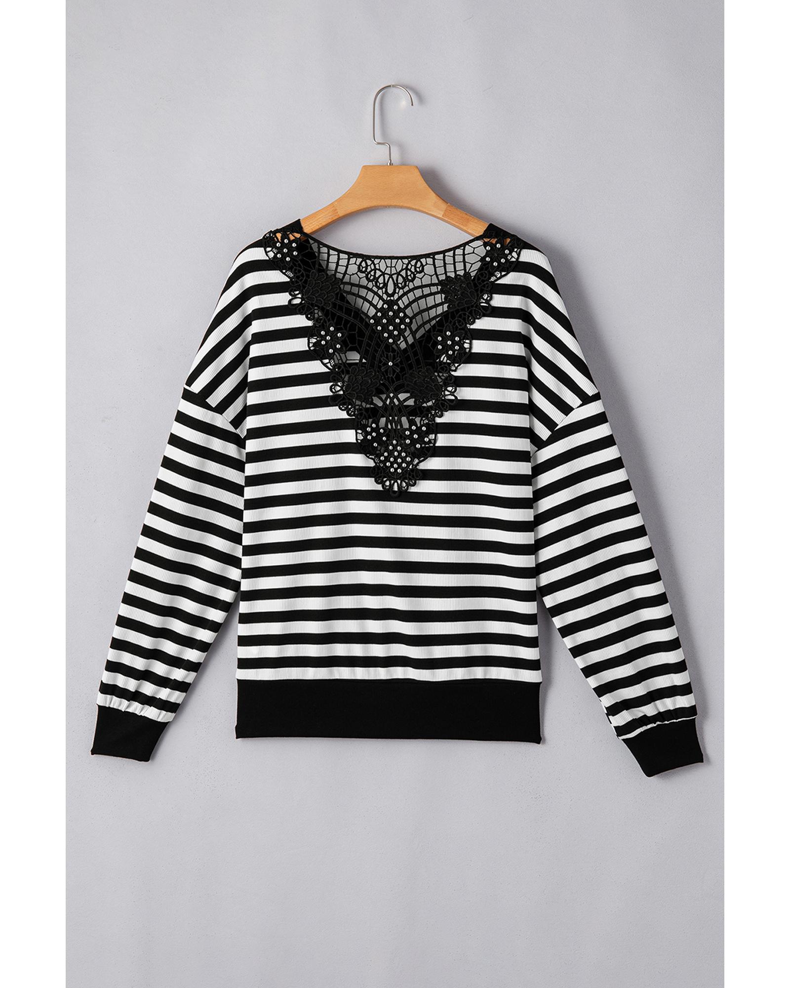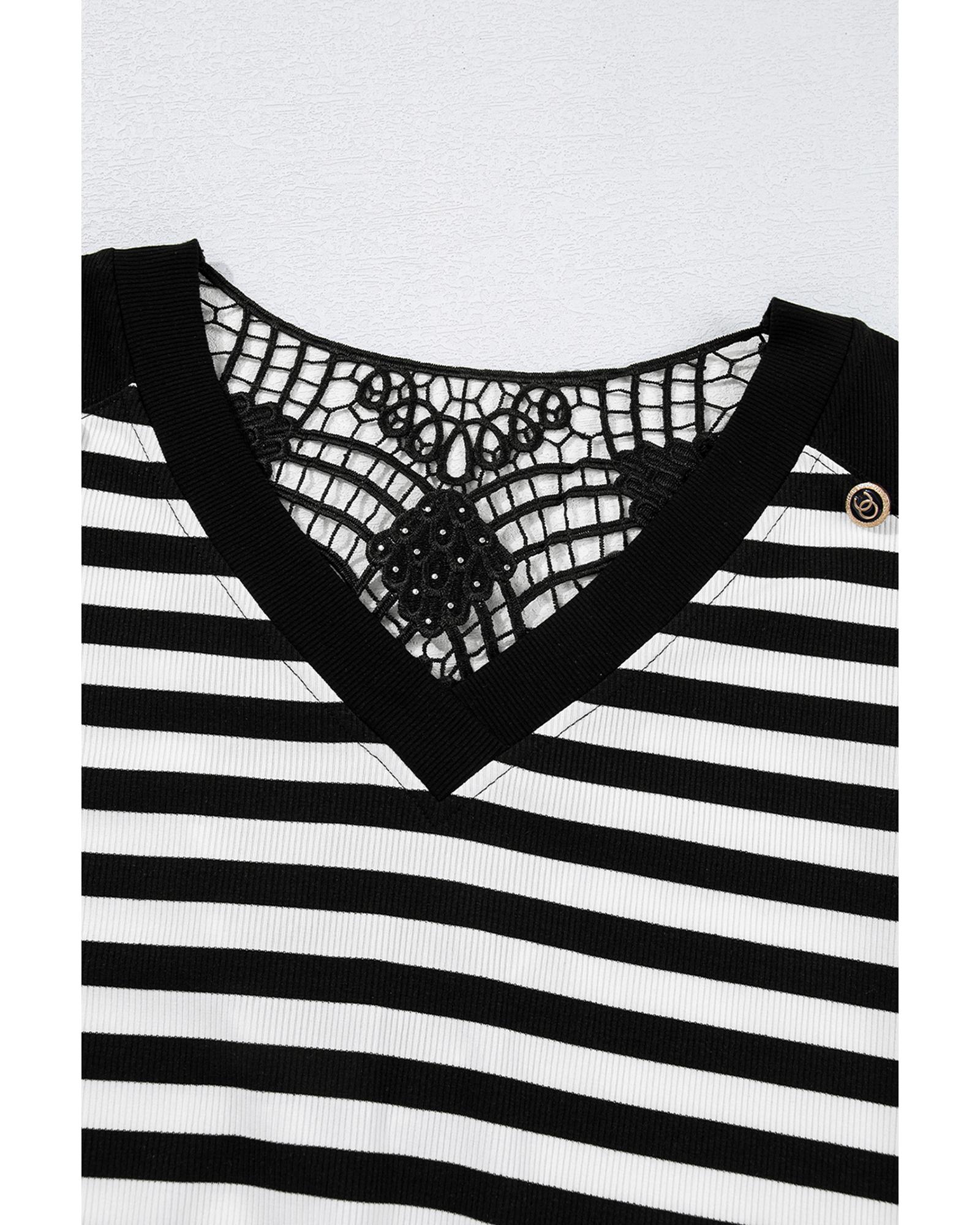 Black Stripe Crochet Hollow-out Back Buttoned Shoulder V Neck Top – S