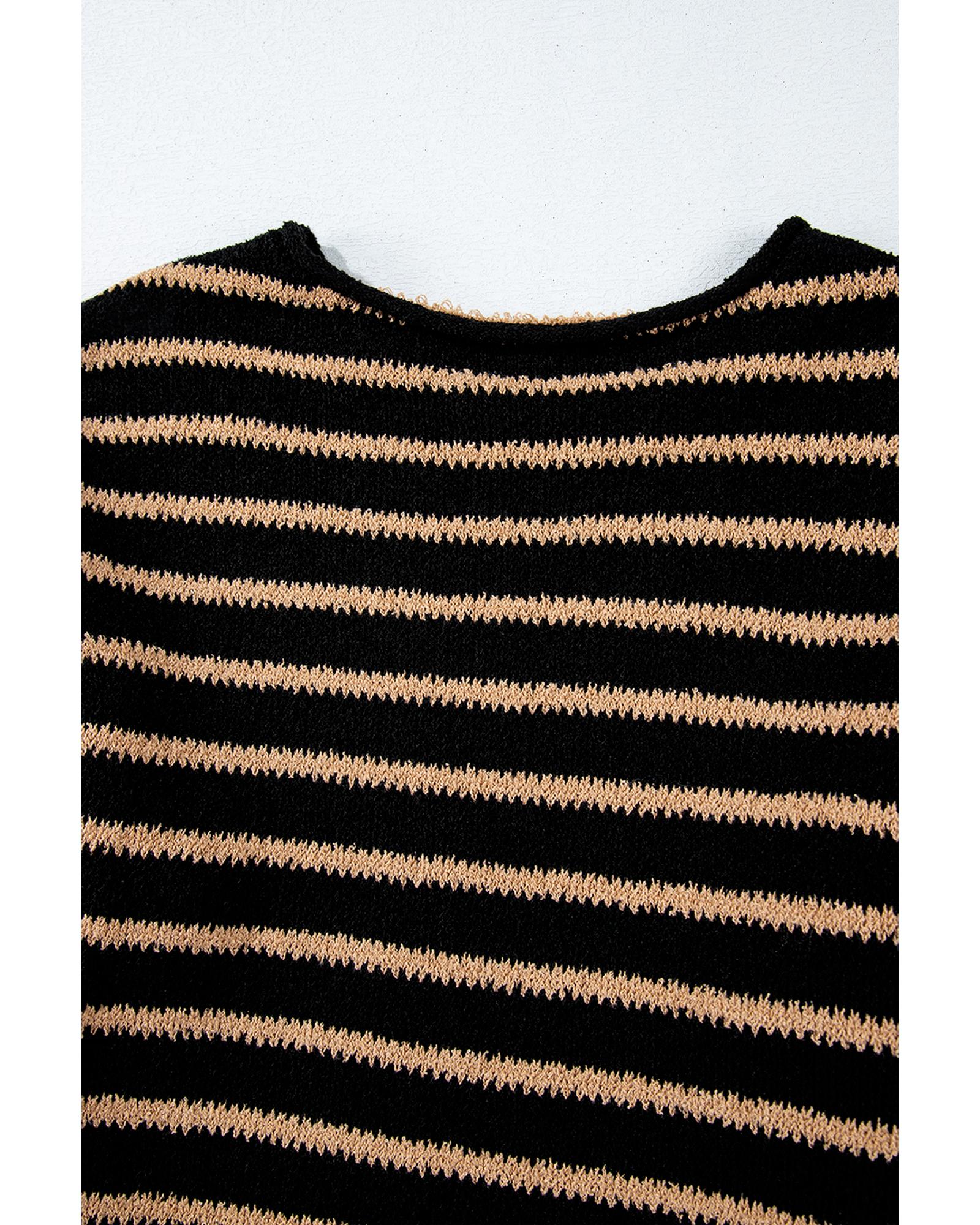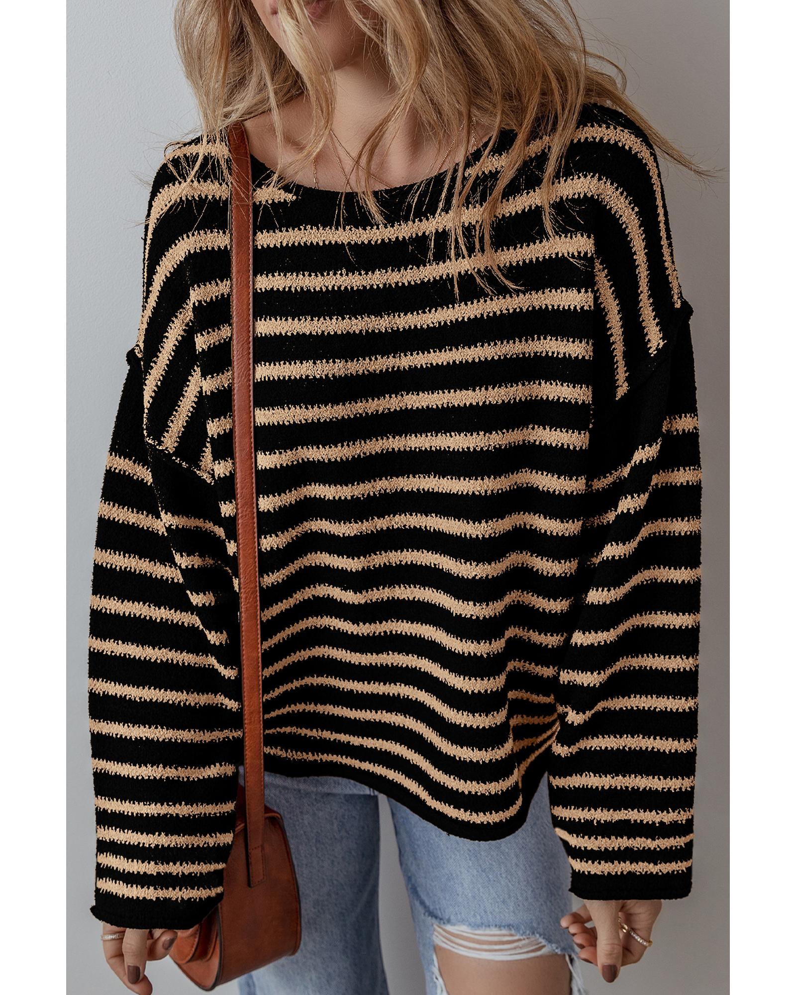 Black Stripe Drop Shoulder Round Neck Loose Sweater – L