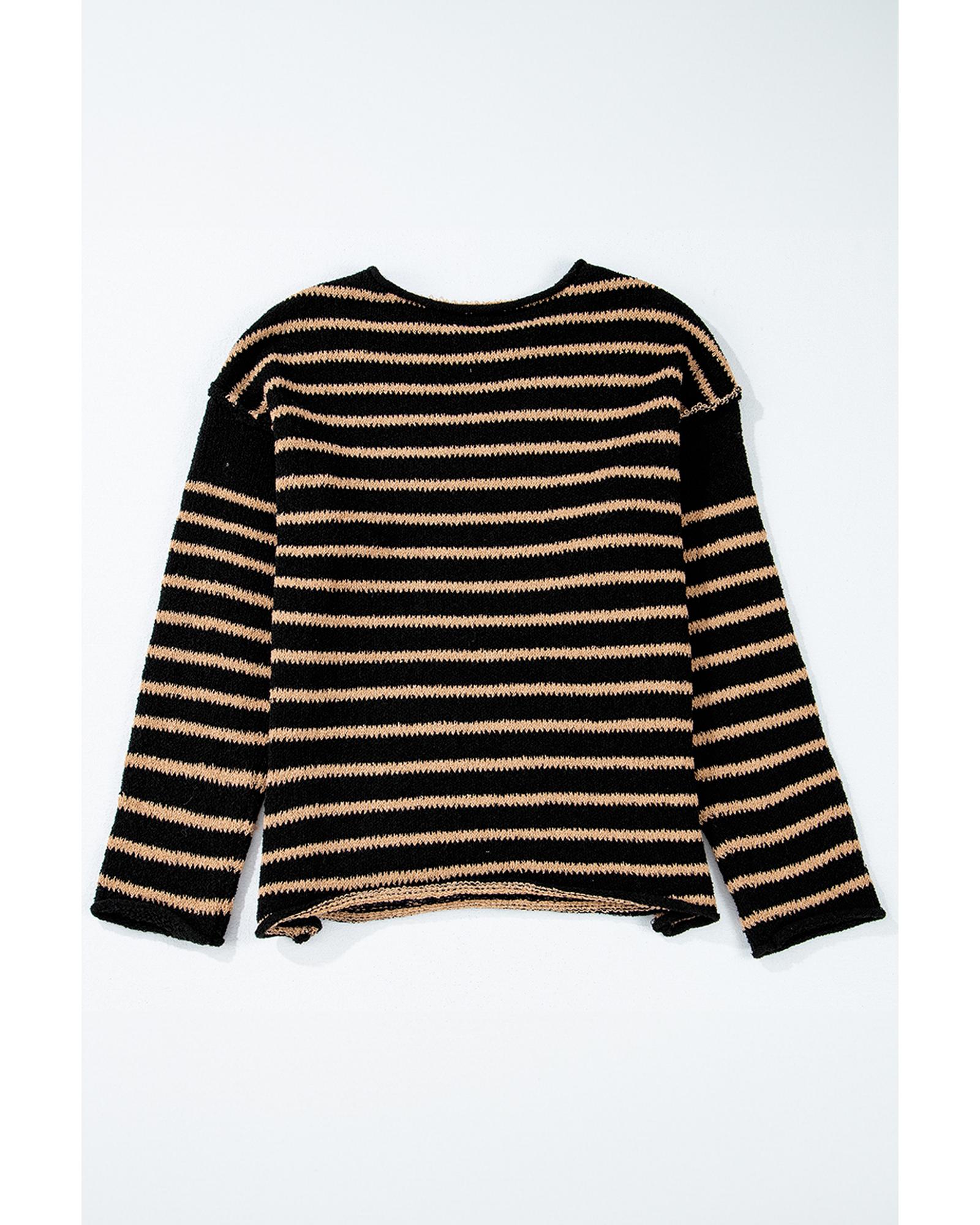 Black Stripe Drop Shoulder Round Neck Loose Sweater – M