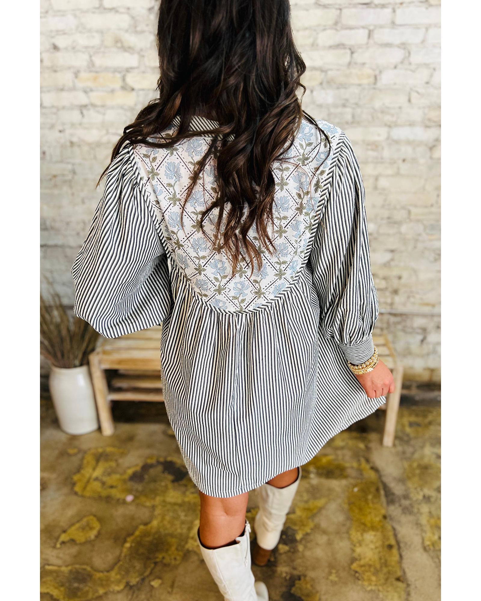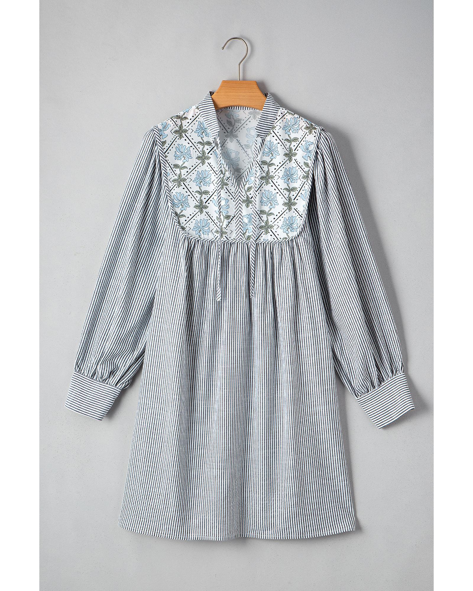 Black Stripe Floral Patchwork Tied V Neck Shift Long Sleeve Mini Dress – S