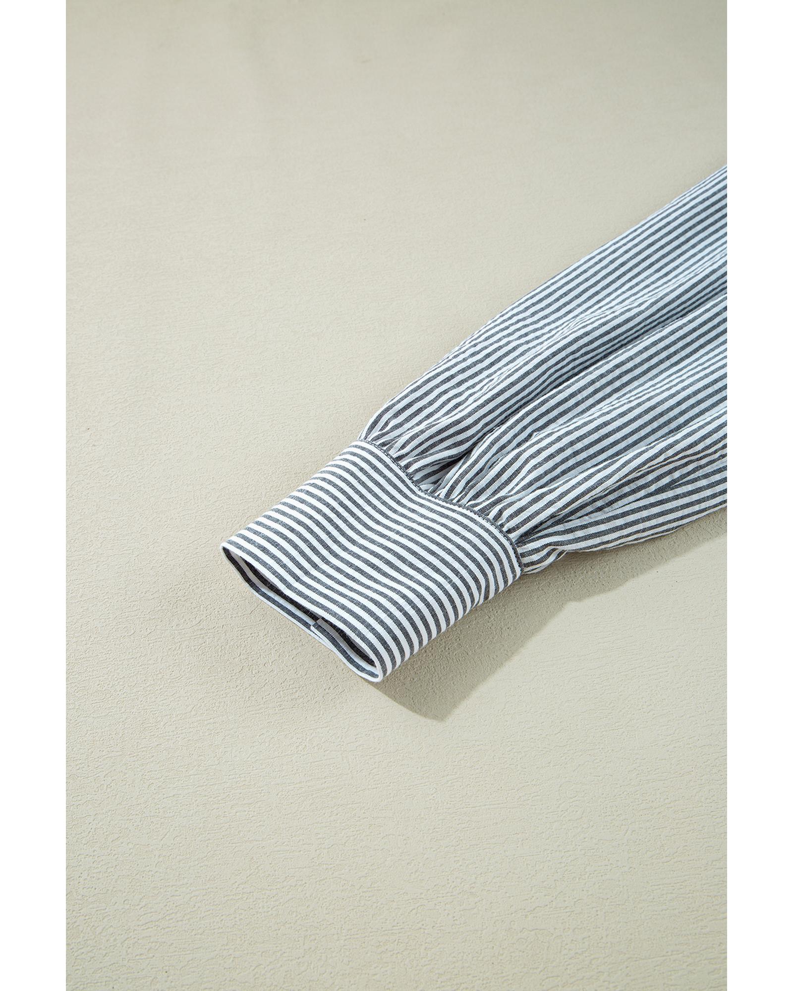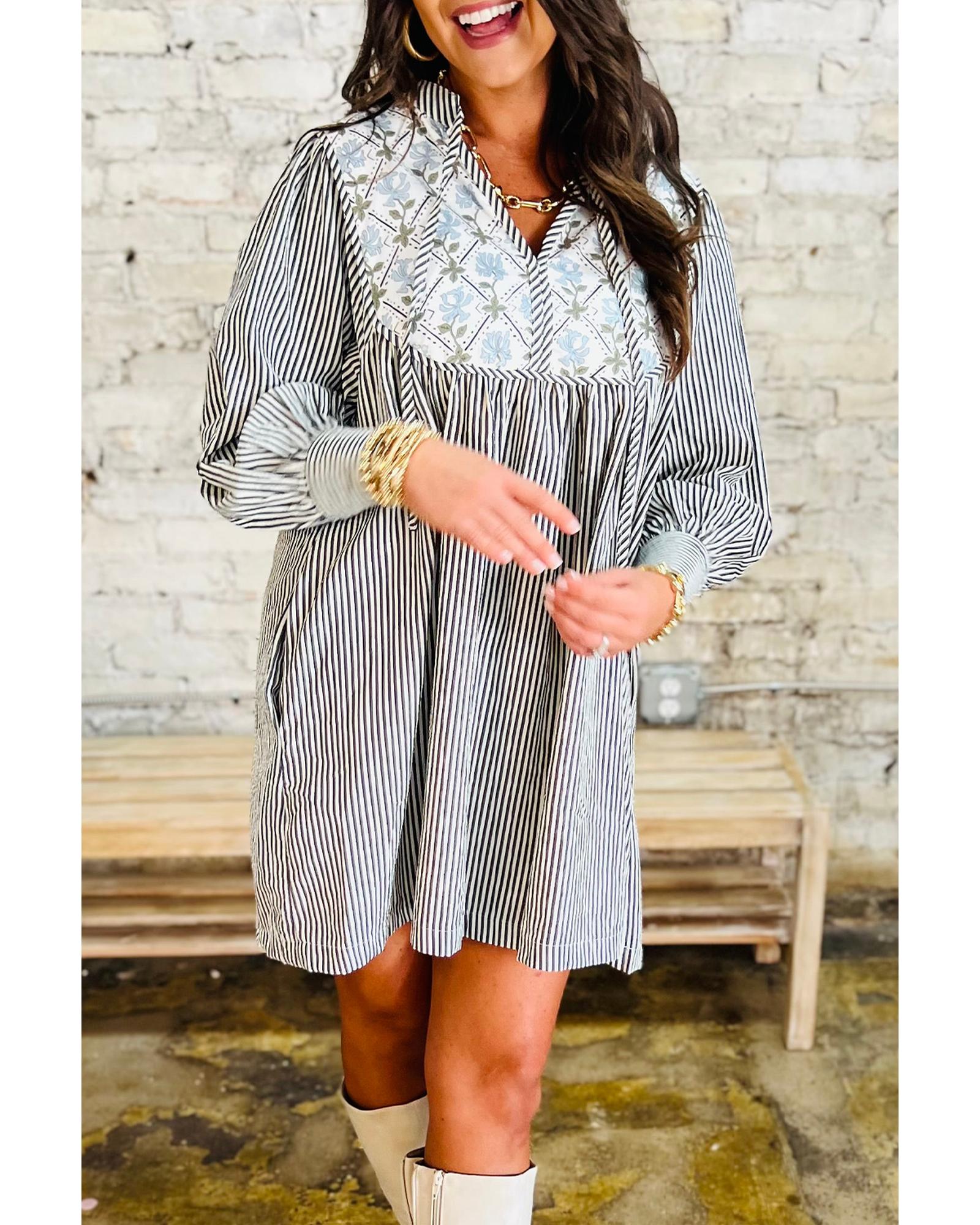 Black Stripe Floral Patchwork Tied V Neck Shift Long Sleeve Mini Dress – XL