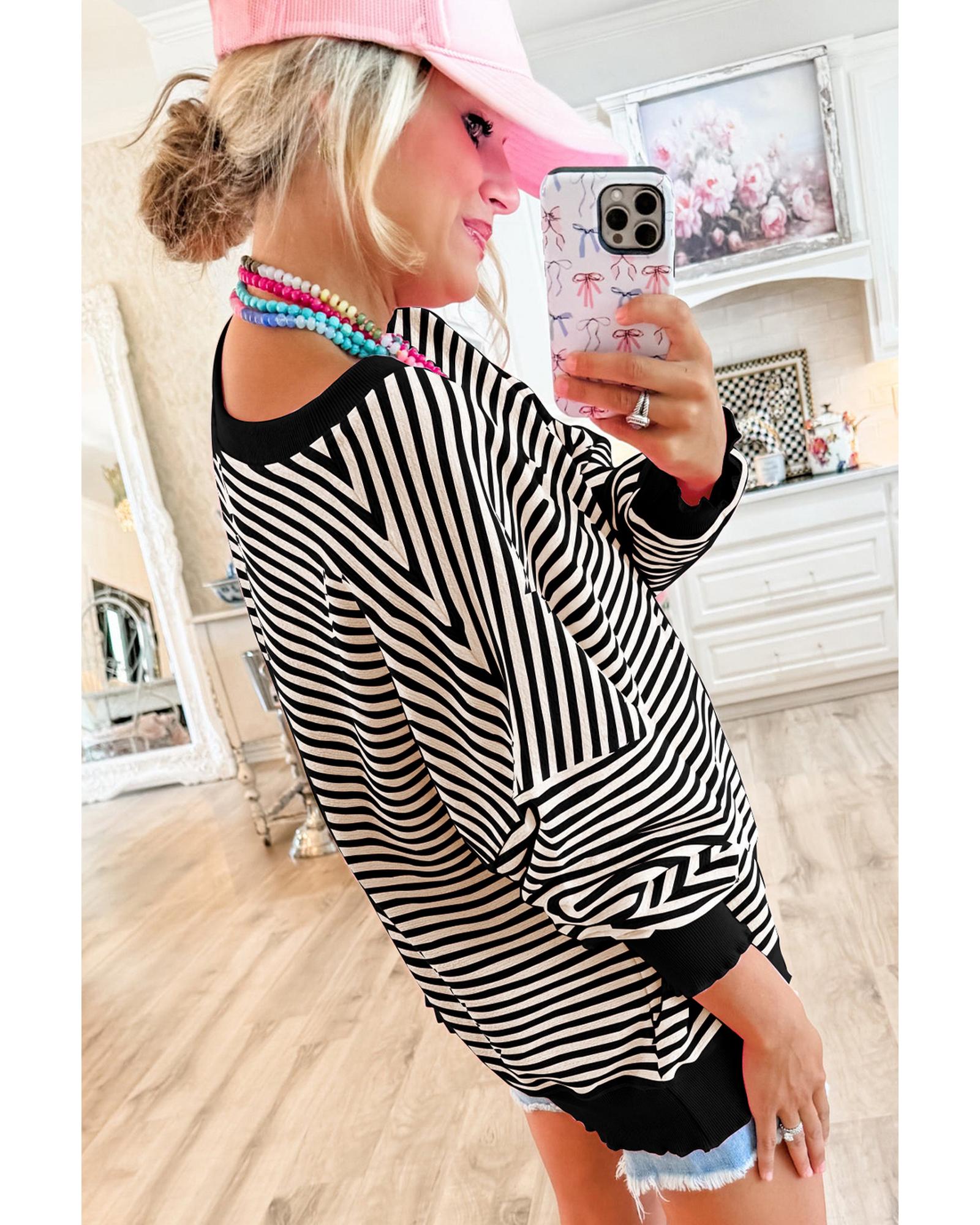 - Black Stripe Loose Drop Shoulder Long Sleeve Top