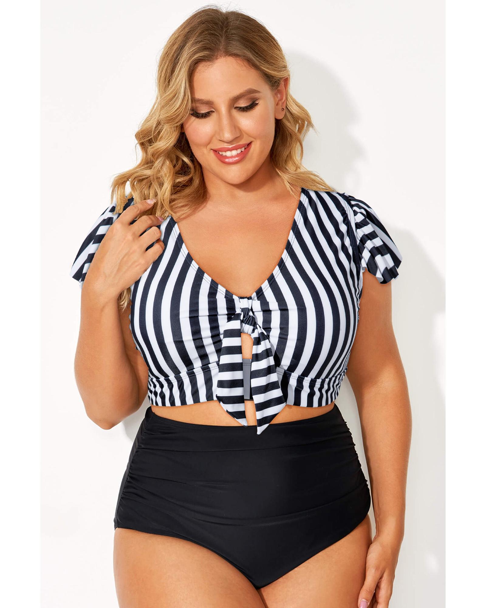 Black Stripe Plus Size Knot Cutout Ruffle Sleeve and High Waisted 2pcs Swimsuit – 2X